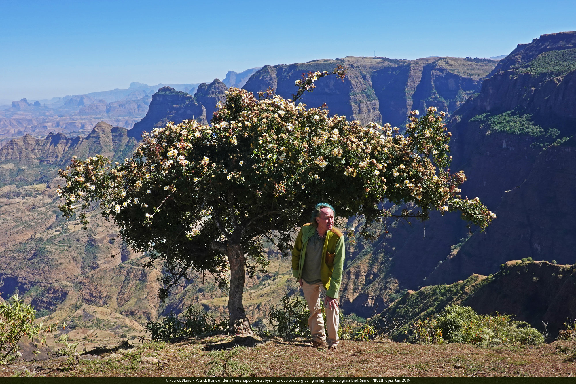 Patrick Blanc under a tree shaped Rosa abyssinica due to overgrazing in high altitude grassland, Simien NP, Ethiopia, Jan. 2019