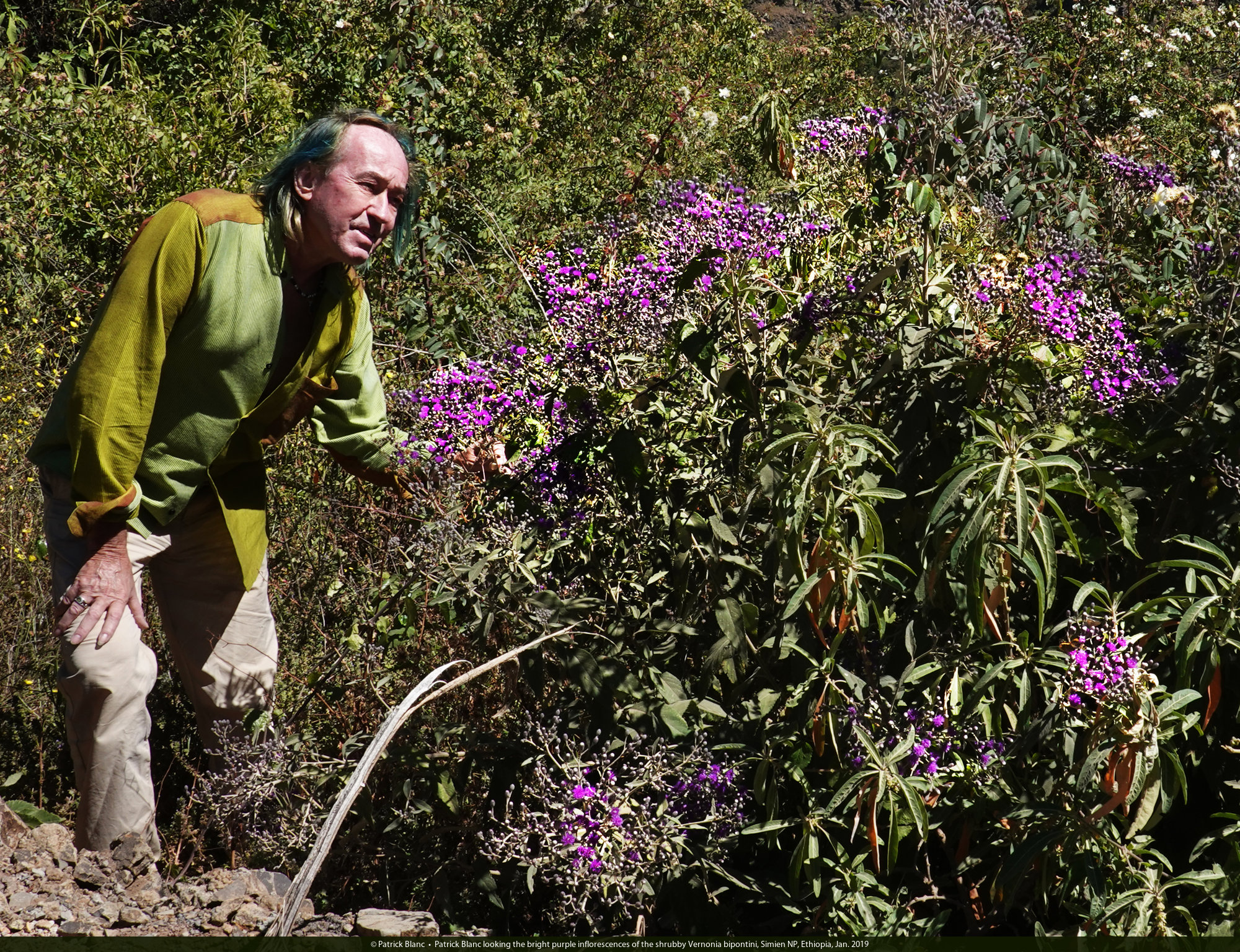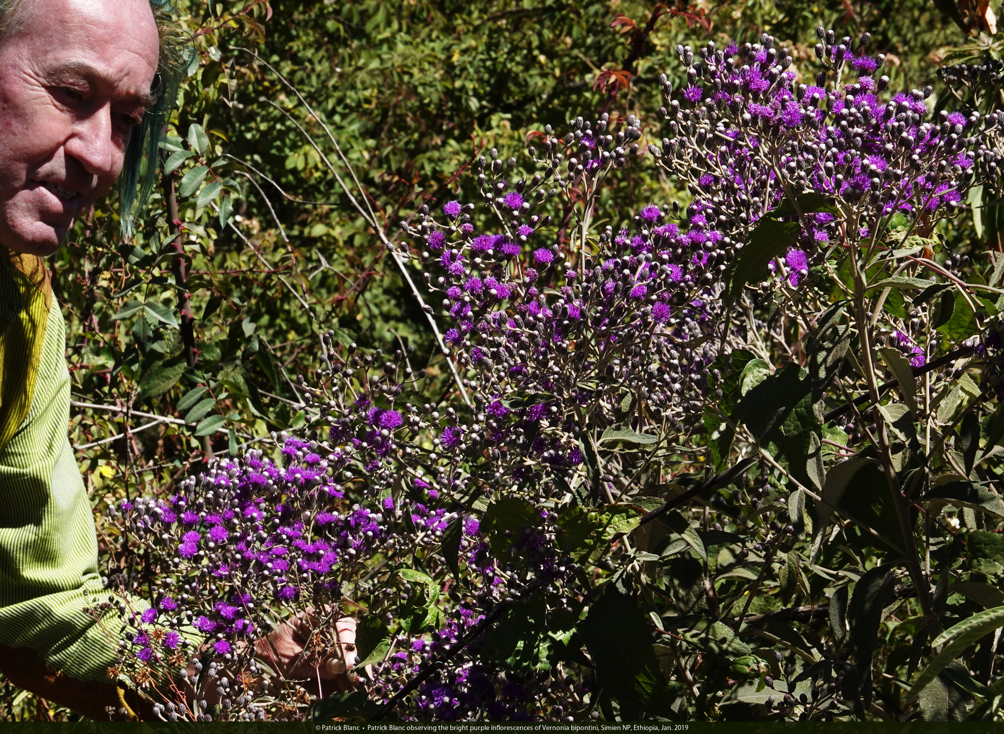 Patrick Blanc observing the bright purple inflorescences of Vernonia bipontini, Simien NP, Ethiopia, Jan. 2019