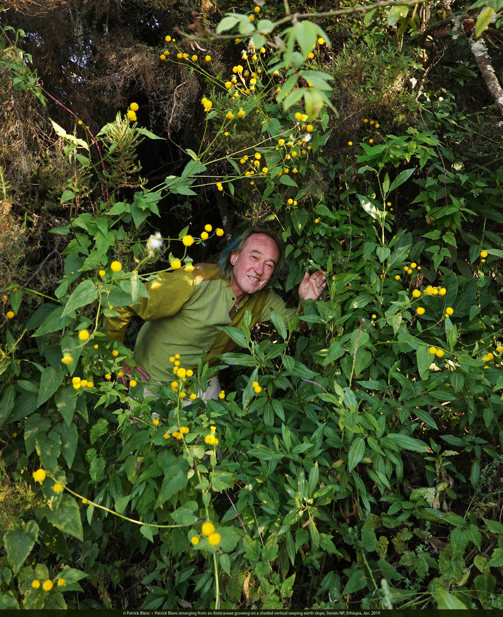 Patrick Blanc emerging from an Asteraceae growing on a shaded vertical seeping earth slope, Simien NP, Ethiopia, Jan. 2019