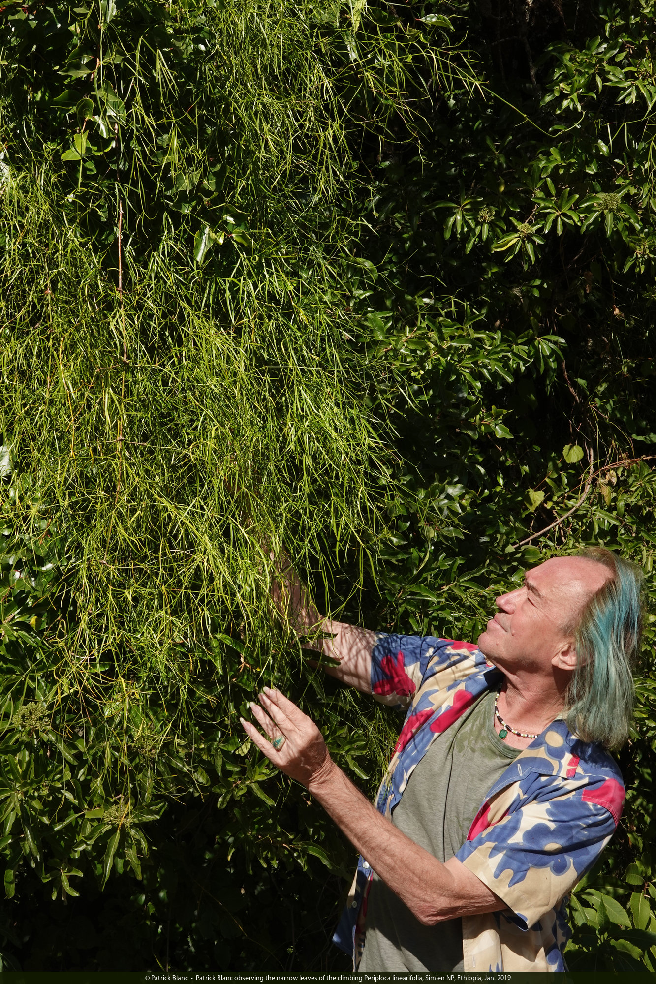 Patrick Blanc observing the narrow leaves of the climbing Periploca linearifolia, Simien NP, Ethiopia, Jan. 2019