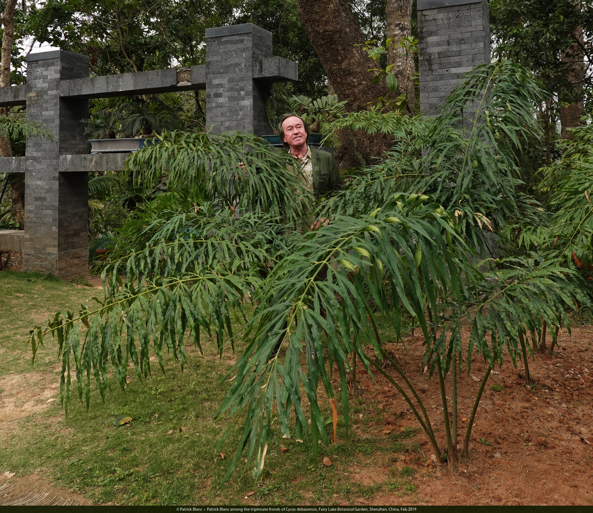Patrick Blanc among the tripinnate fronds of Cycas debaoensis, Fairy Lake Botanical Garden, Shenzhen, China, Feb.2019