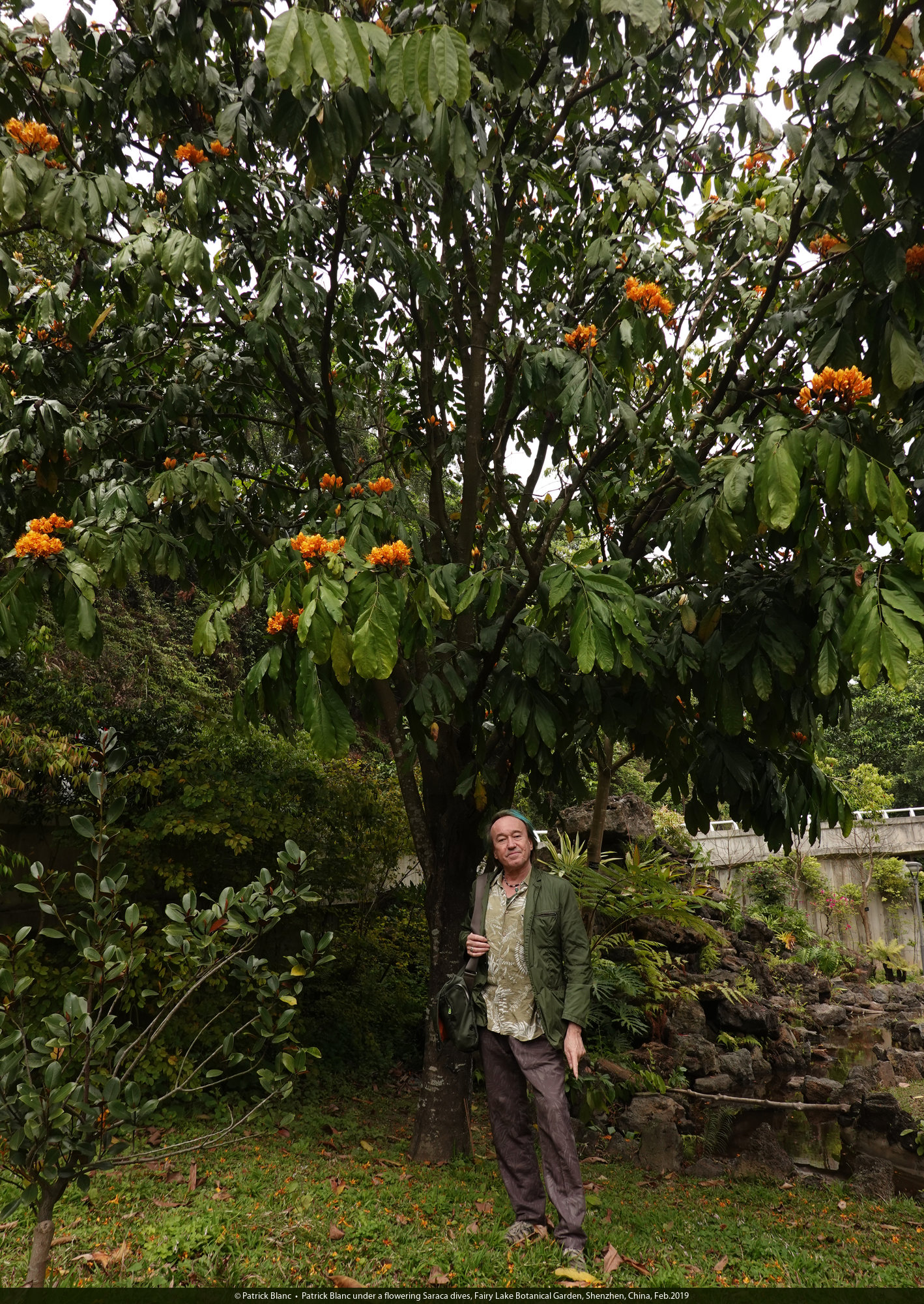 Patrick Blanc under a flowering Saraca dives, Fairy Lake Botanical Garden, Shenzhen, China, Feb.2019