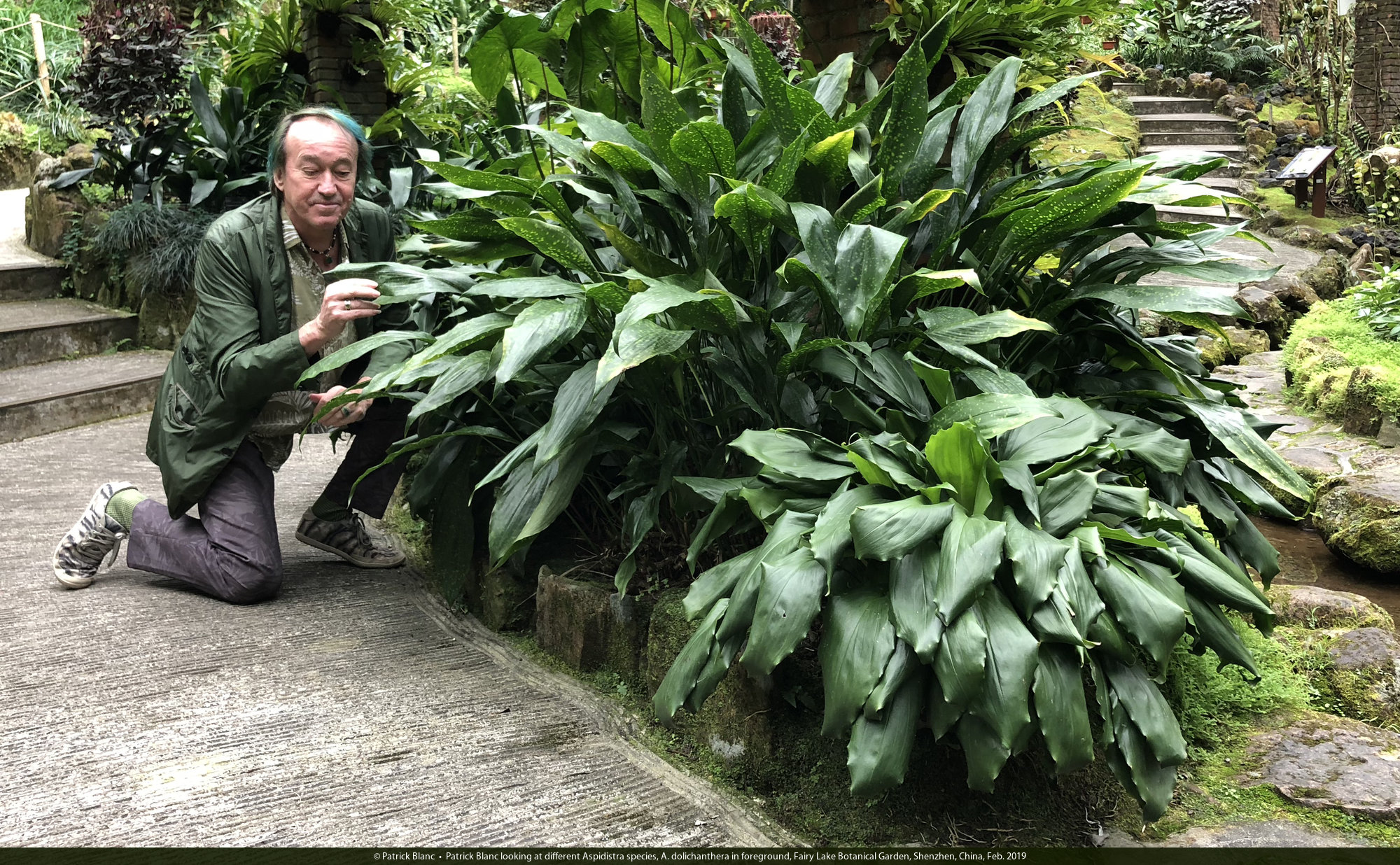 Patrick Blanc looking at different Aspidistra species, A. dolichanthera in foreground, Fairy Lake Botanical Garden, Shenzhen, China, Feb. 2019