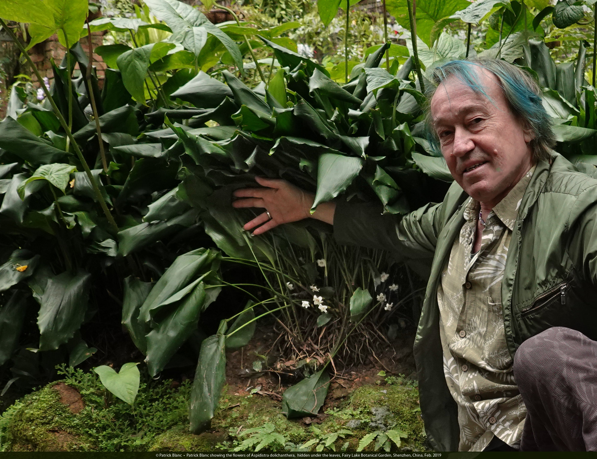 Patrick Blanc showing the flowers of Aspidistra dolichanthera, hidden under the leaves, Fairy Lake Botanical Garden, Shenzhen, China, Feb. 2019