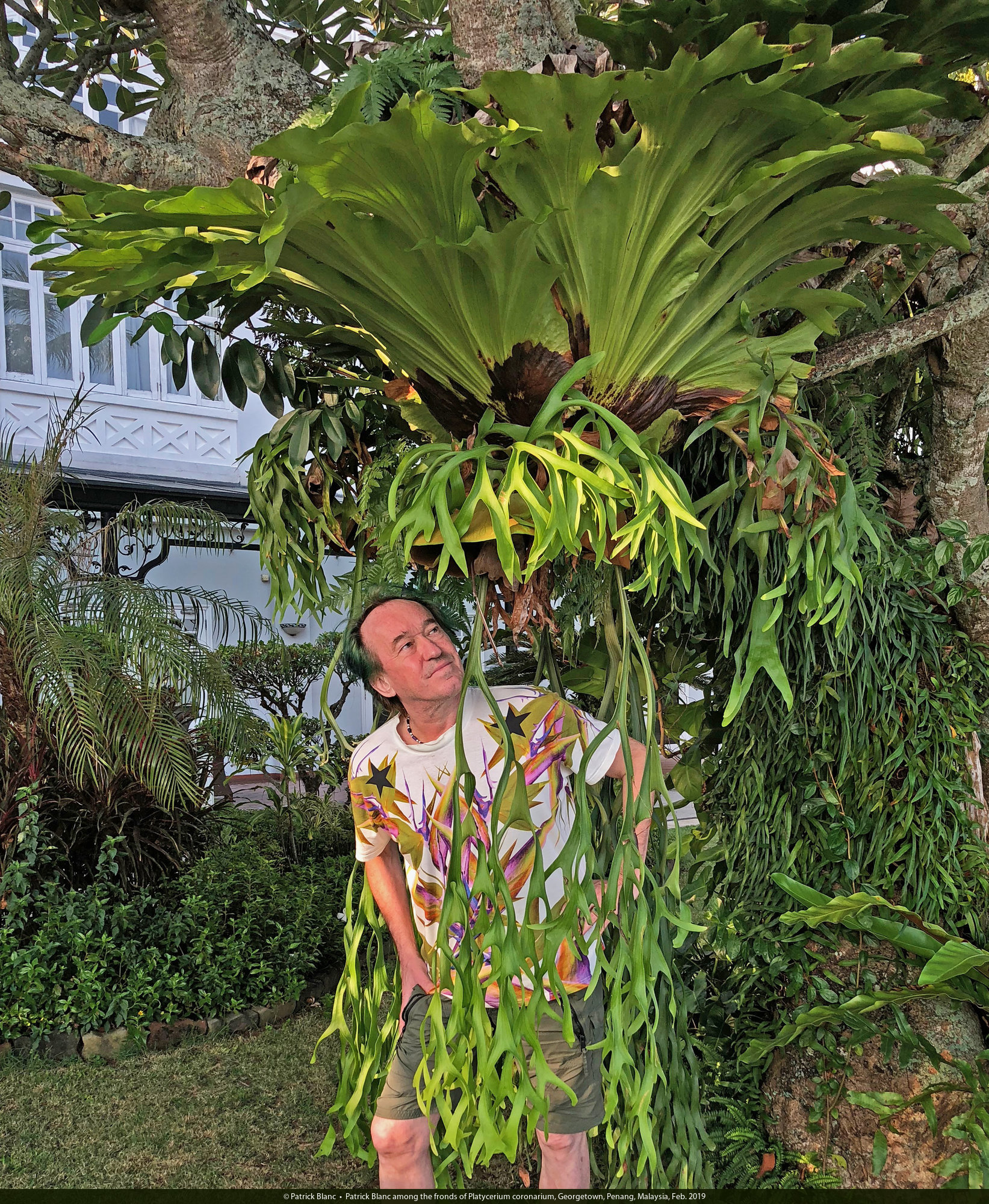 Patrick Blanc among the fronds of Platycerium coronarium, Georgetown, Penang, Malaysia, Feb. 2019