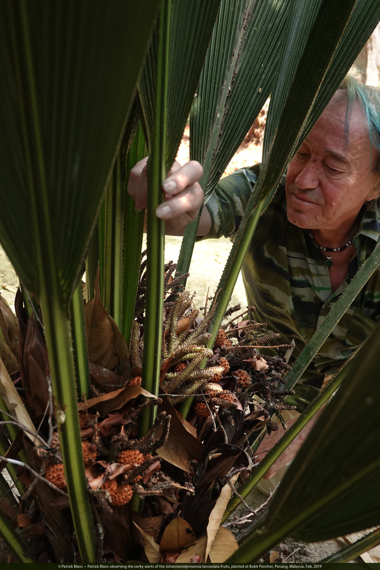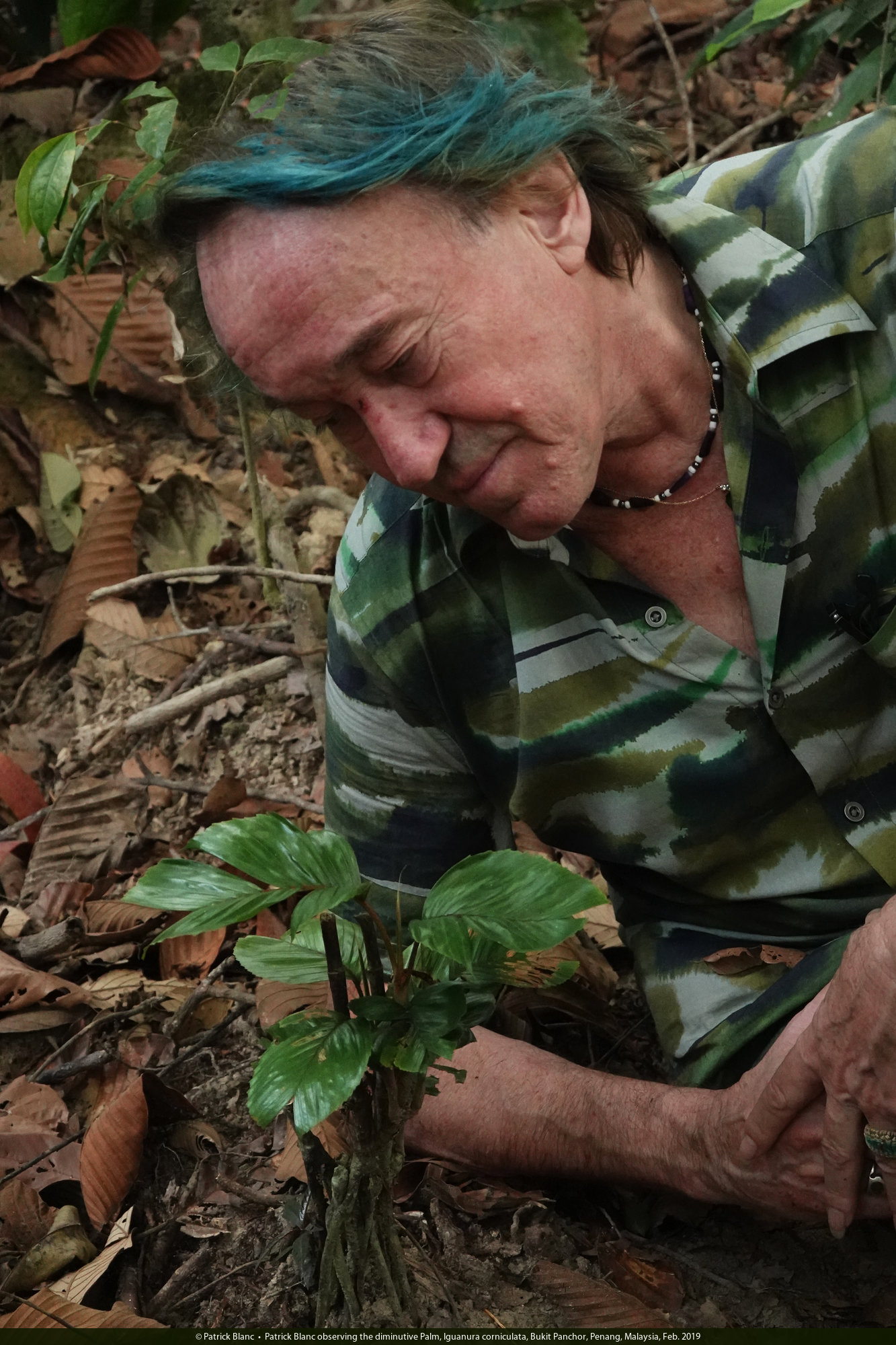 Patrick Blanc observing the corky warts of the Johannesteijsmannia lanceolata fruits, planted at Bukit Panchor, Penang, Malaysia, Feb. 2019