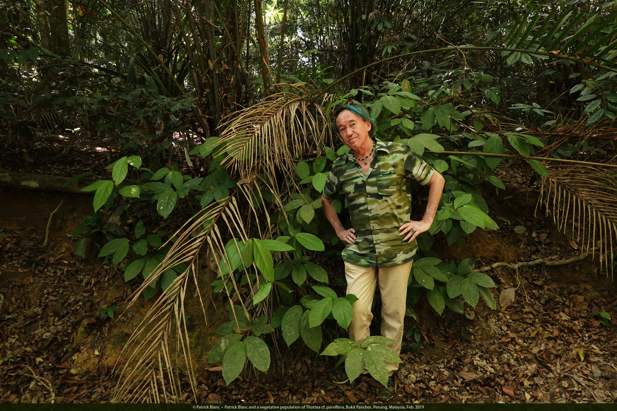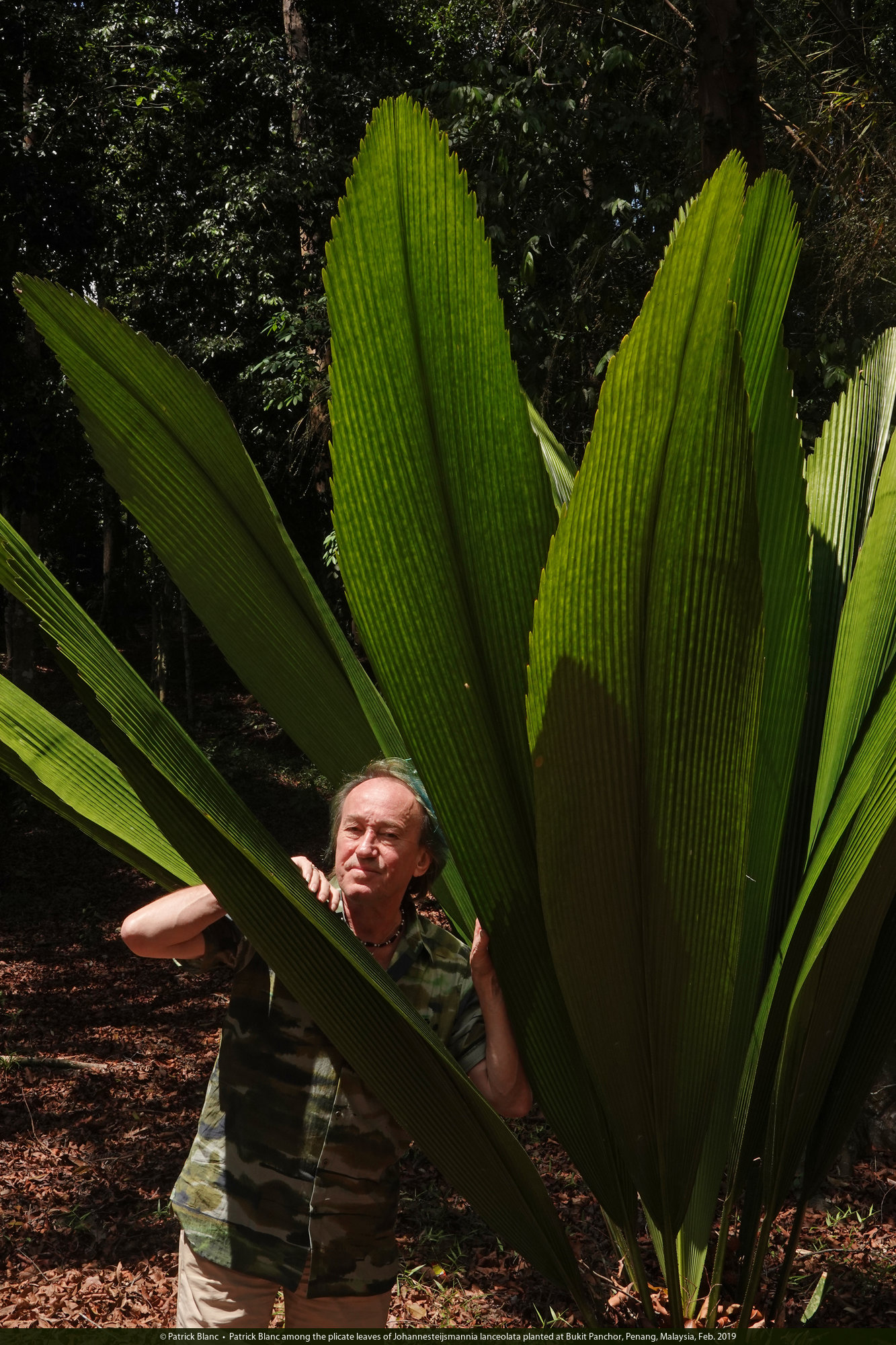 Patrick Blanc among the plicate leaves of Johannesteijsmannia lanceolata planted at Bukit Panchor, Penang, Malaysia, Feb. 2019