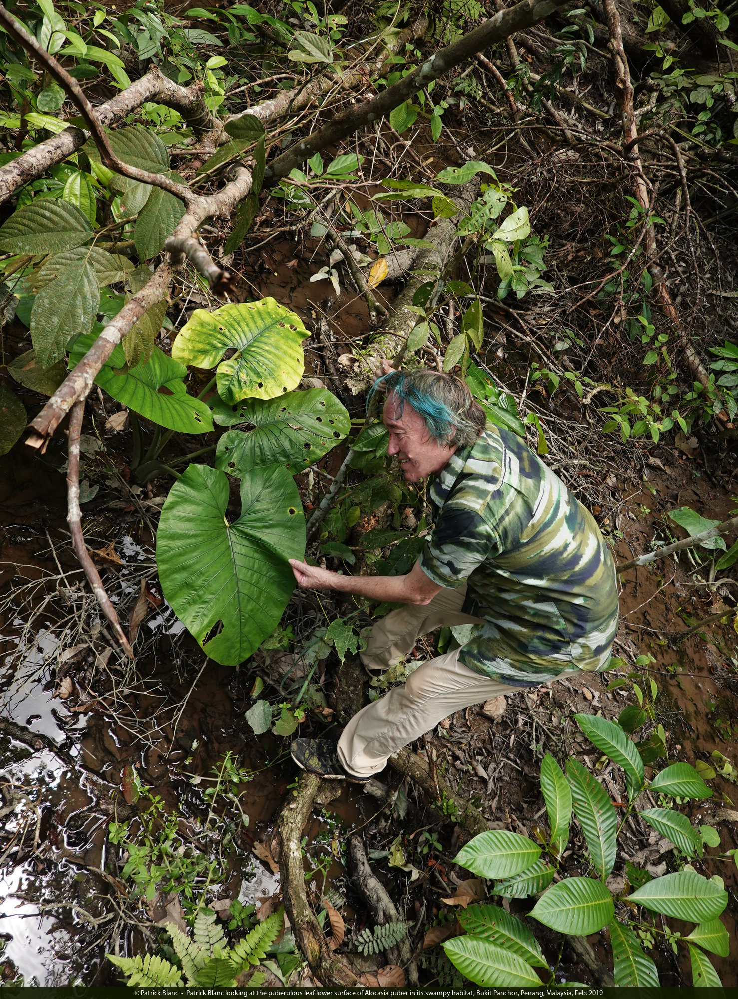 Patrick Blanc looking at the puberulous leaf lower surface of Alocasia puber in its swampy habitat, Bukit Panchor, Penang, Malaysia, Feb. 2019