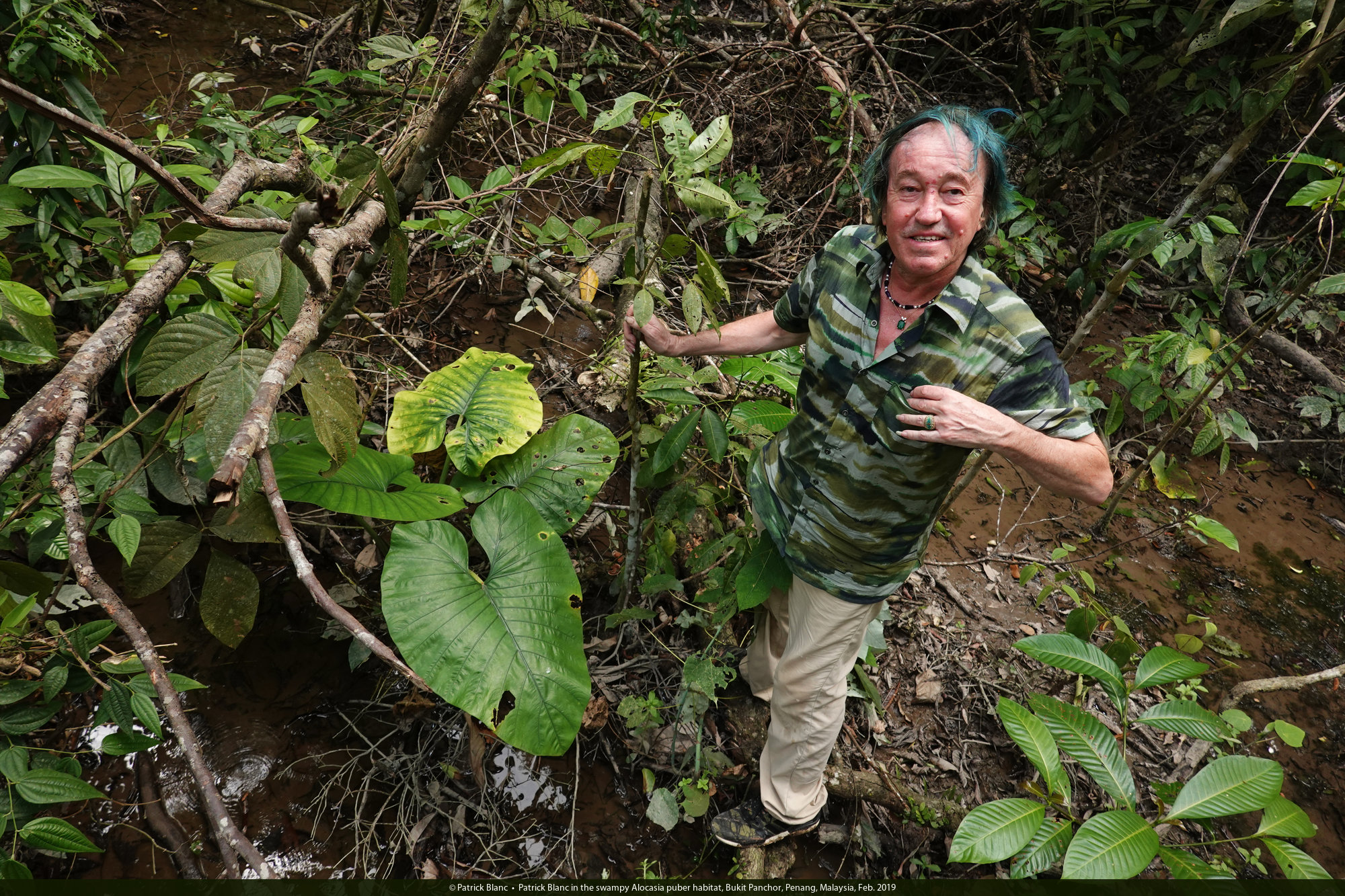 Patrick Blanc in the swampy Alocasia puber habitat, Bukit Panchor, Penang, Malaysia, Feb. 2019