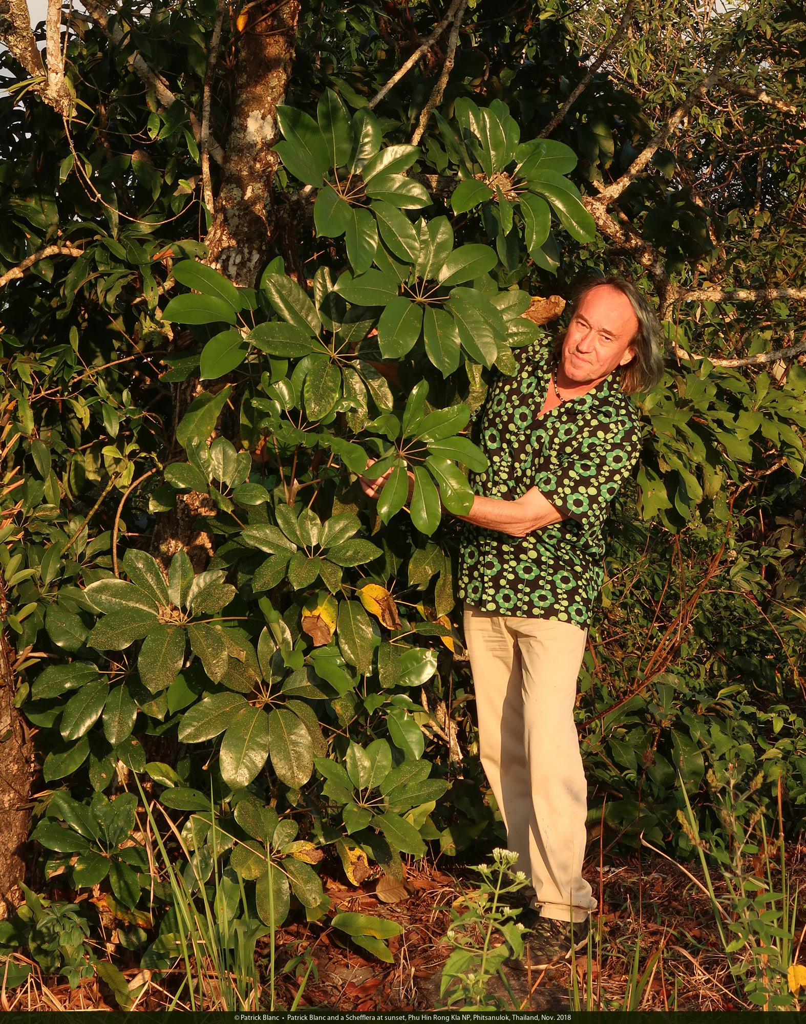Patrick Blanc and a Schefflera at sunset, Phu Hin Rong Kla NP, Phitsanulok, Thailand, Nov. 2018
