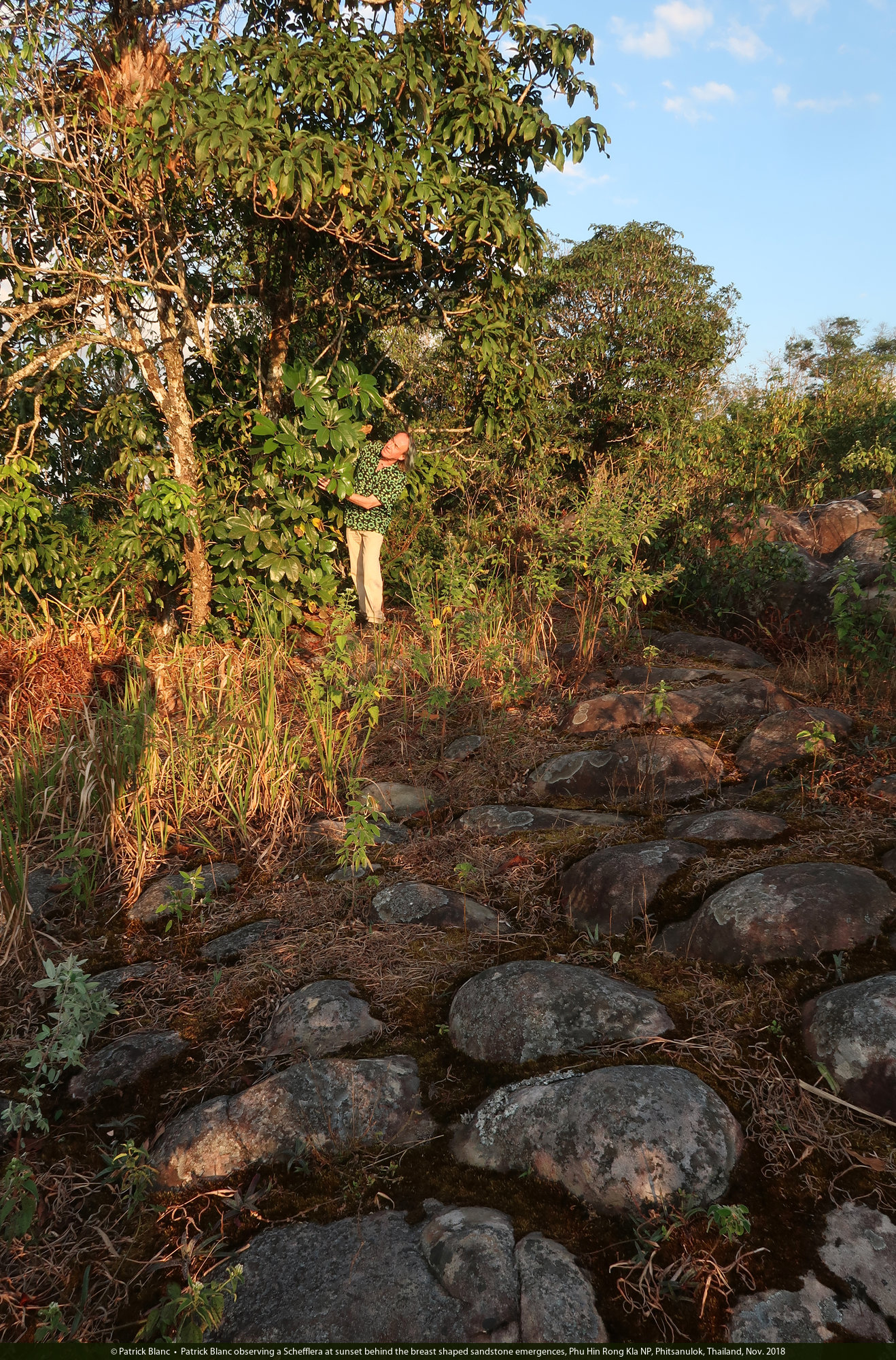 Patrick Blanc observing a Schefflera at sunset behind the breast shaped sandstone emergences, Phu Hin Rong Kla NP, Phitsanulok, Thailand, Nov. 2018