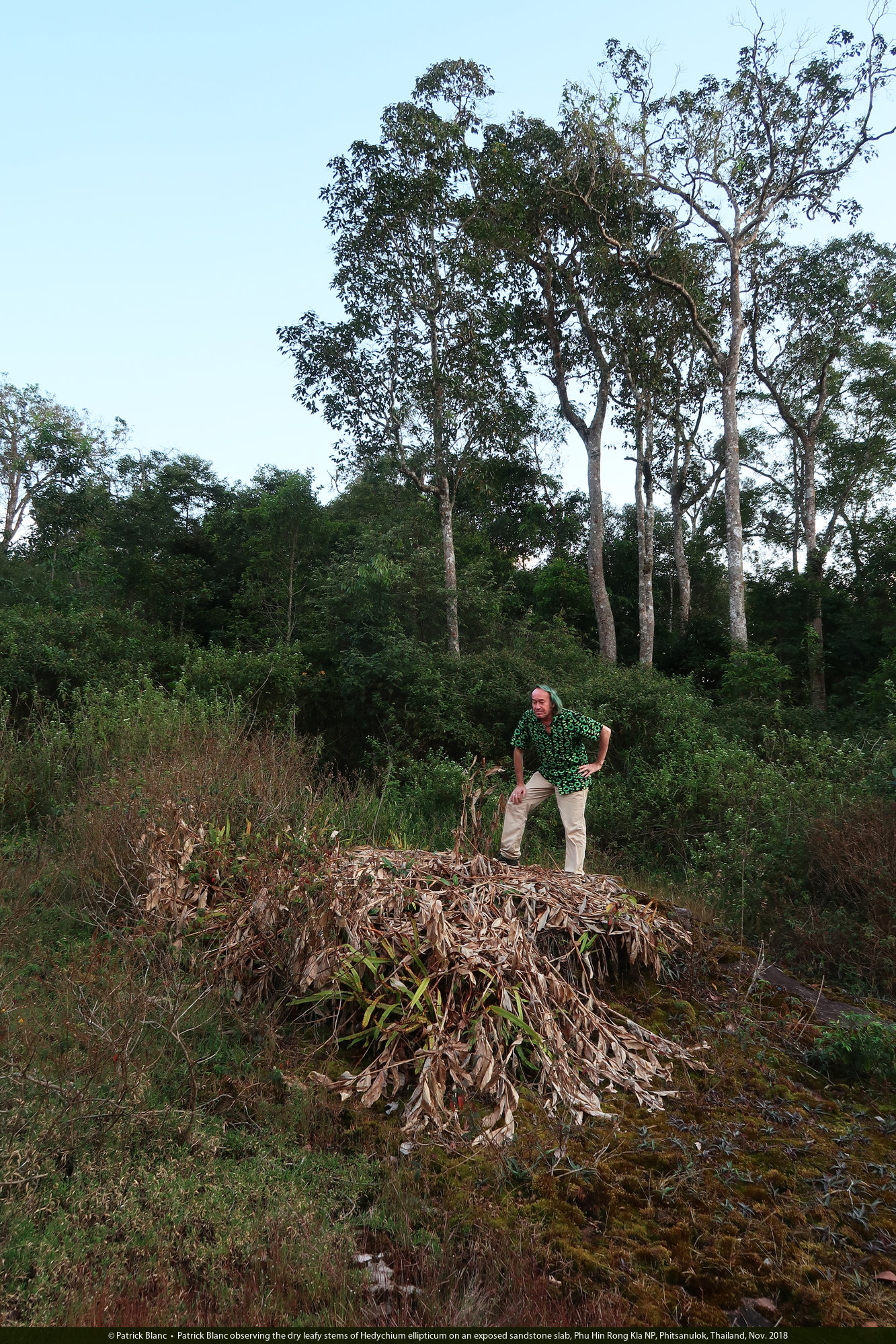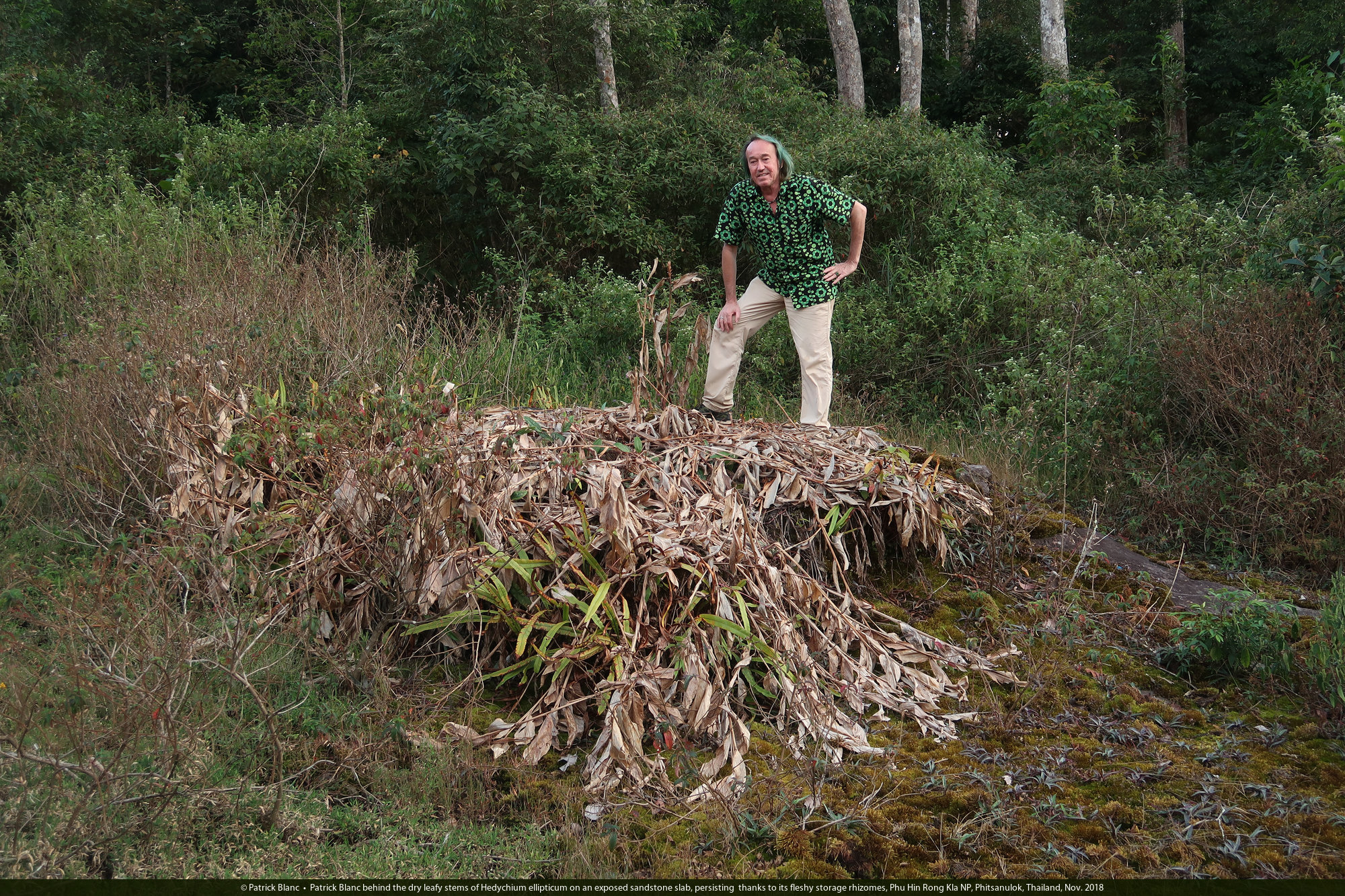 Patrick Blanc behind the dry leafy stems of Hedychium ellipticum on an exposed sandstone slab, persisting thanks to its fleshy storage rhizomes, Phu Hin Rong Kla NP, Phitsanulok, Thailand, Nov. 2018