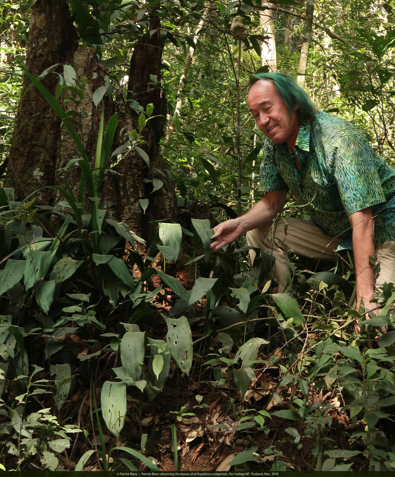 Patrick Blanc observing the leaves of of Aspidistra sutepensis, Doi Suthep NP, Thailand, Nov. 2018