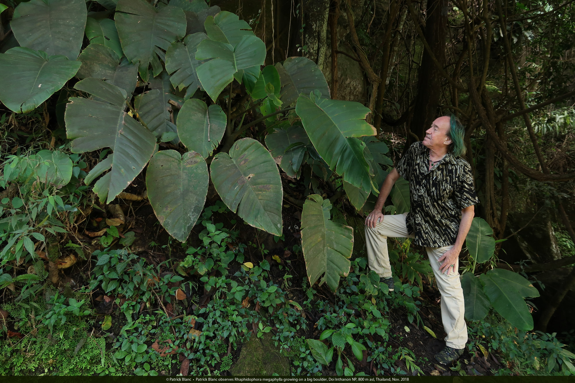 Patrick Blanc observes Rhaphidophora megaphylla growing on a big boulder, Doi Inthanon NP, 800 m asl, Thailand, Nov. 2018
