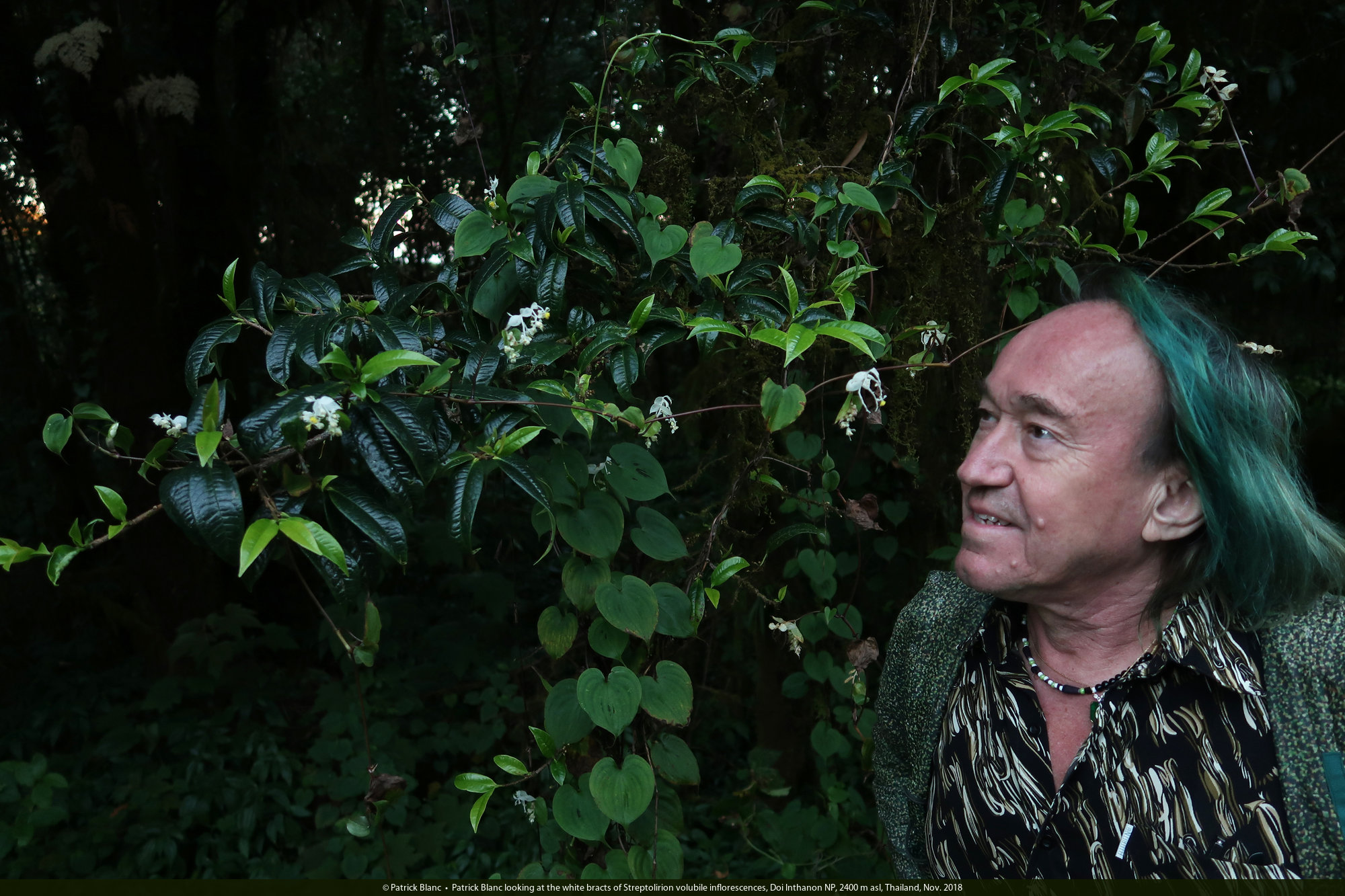 Patrick Blanc looking at the white bracts of Streptolirion volubile inflorescences, Doi Inthanon NP, 2400 m asl, Thailand, Nov. 2018