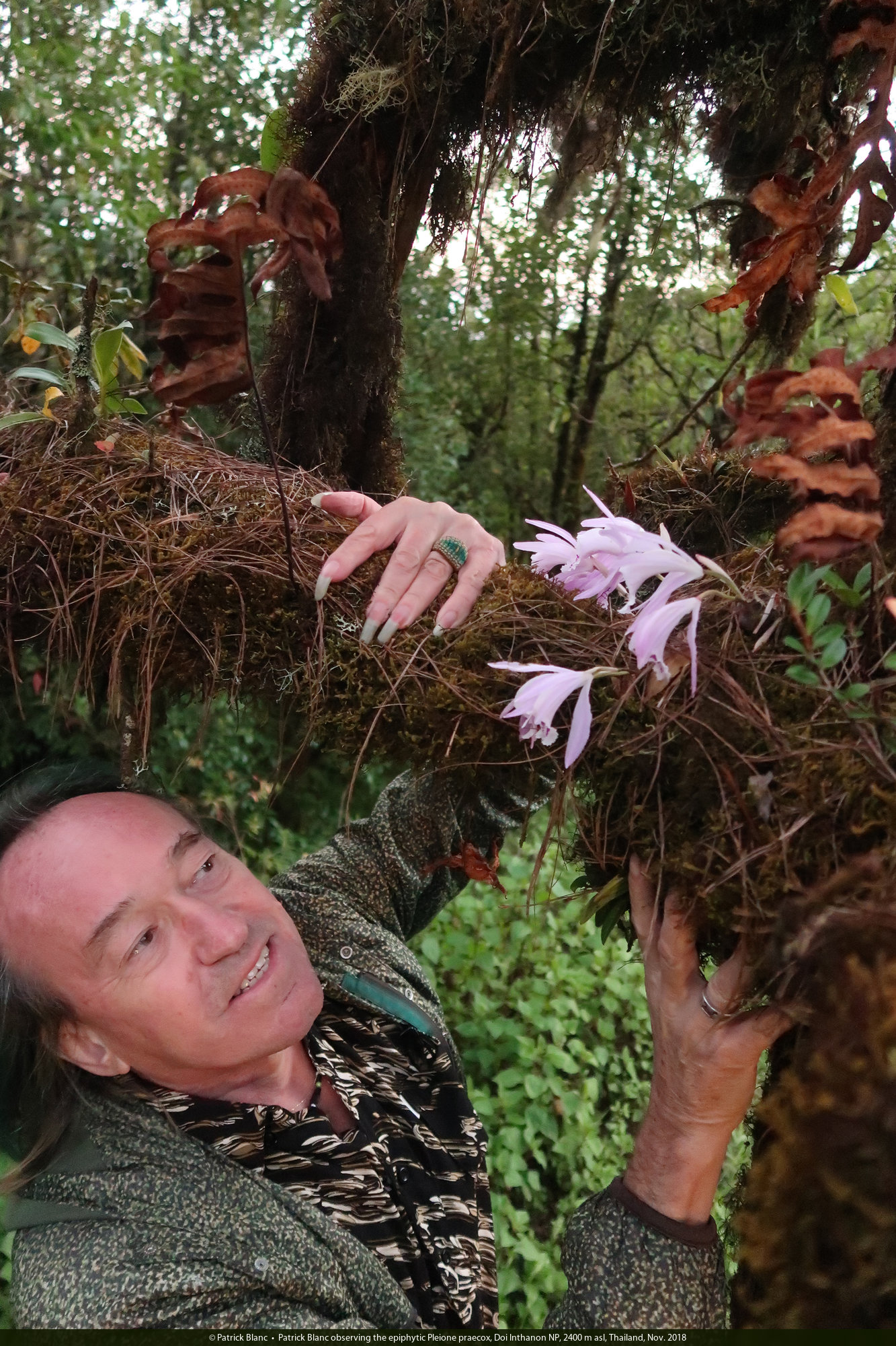 Patrick Blanc observing the epiphytic Pleione praecox, Doi Inthanon NP, 2400 m asl, Thailand, Nov. 2018