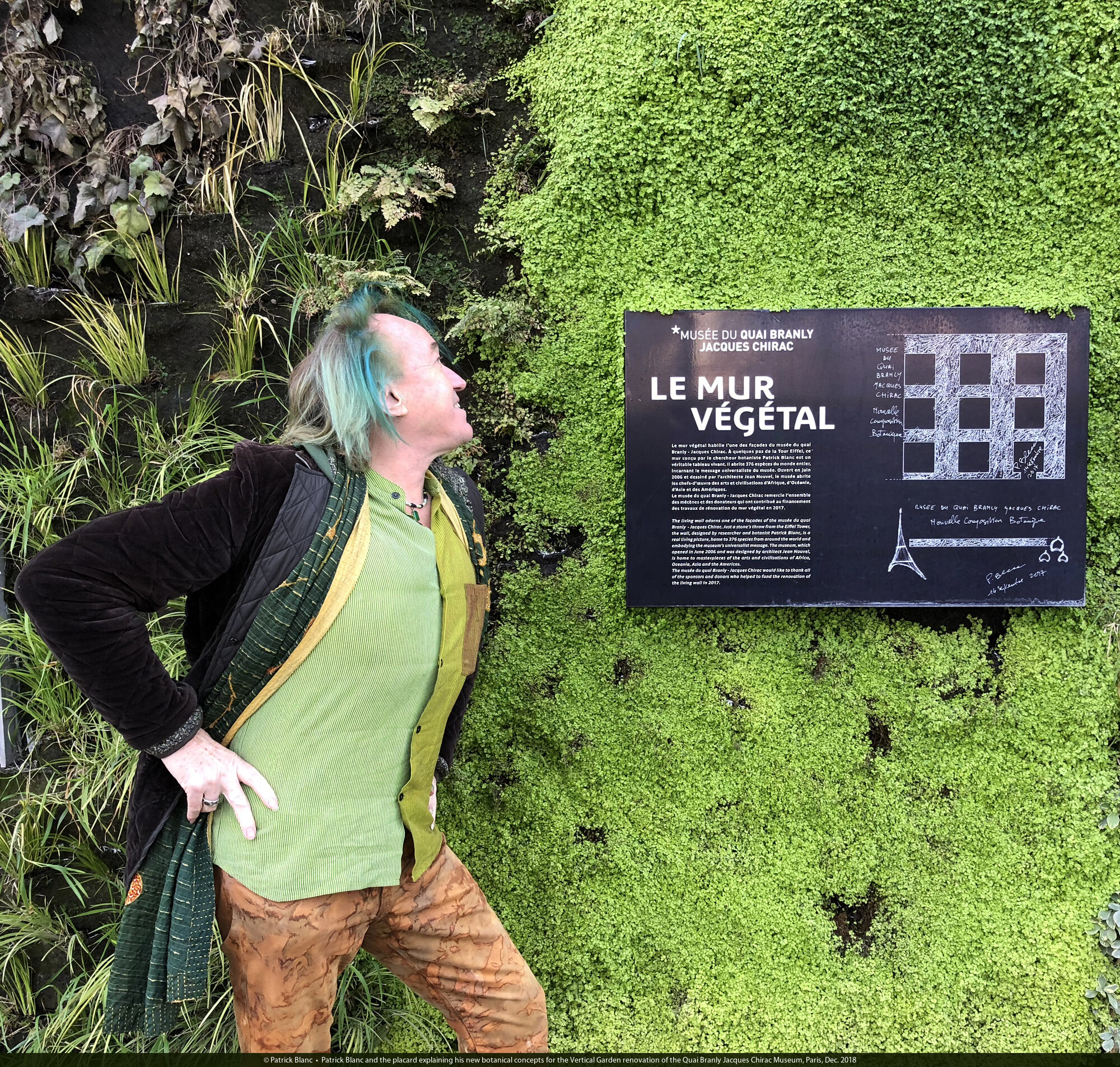 Patrick Blanc and the placard explaining his new botanical concepts for the Vertical Garden renovation of the Quai Branly Jacques Chirac Museum, Paris, Dec. 2018