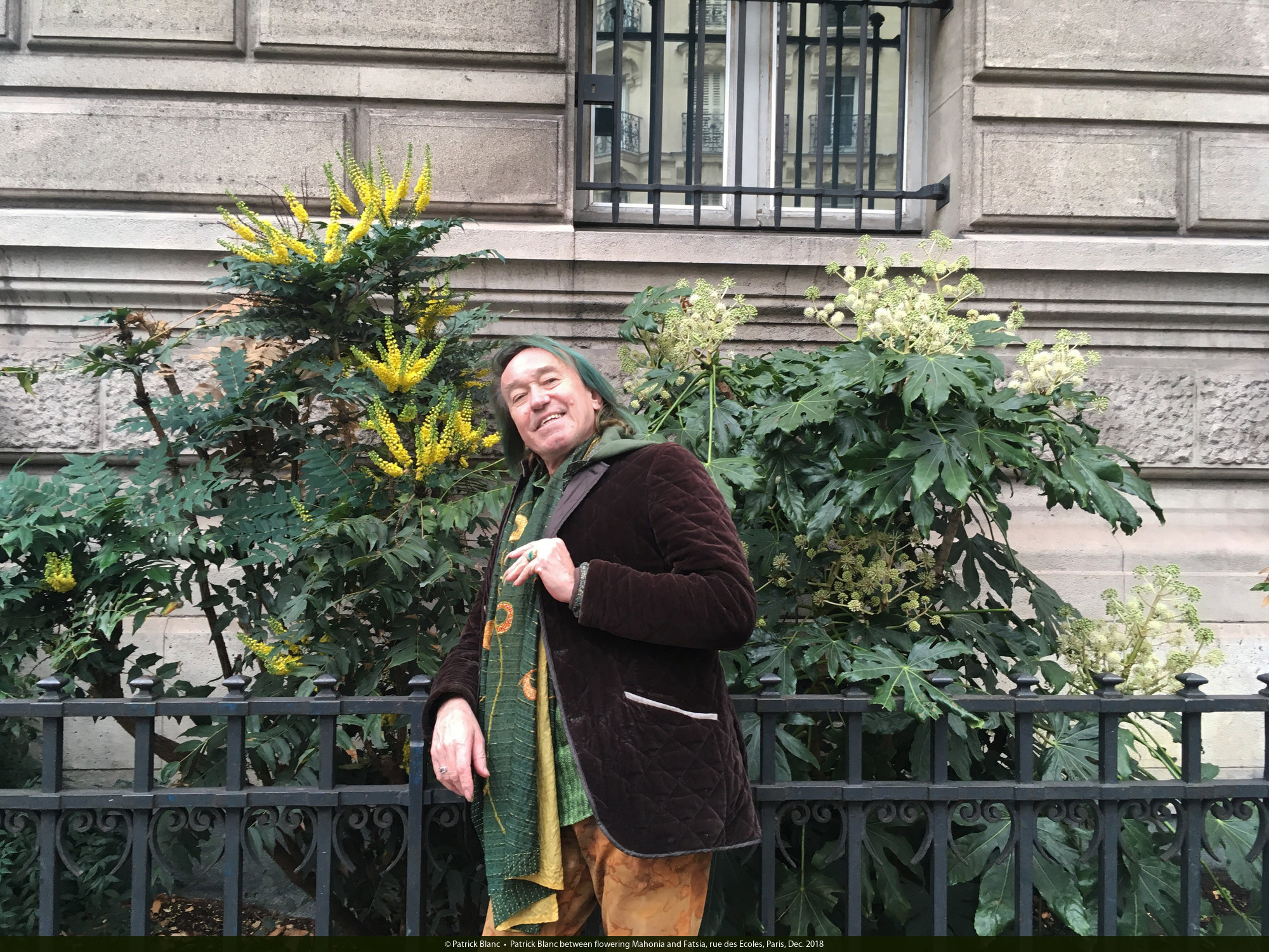 Patrick Blanc between flowering Mahonia and Fatsia, rue des Ecoles, Paris, Dec. 2018