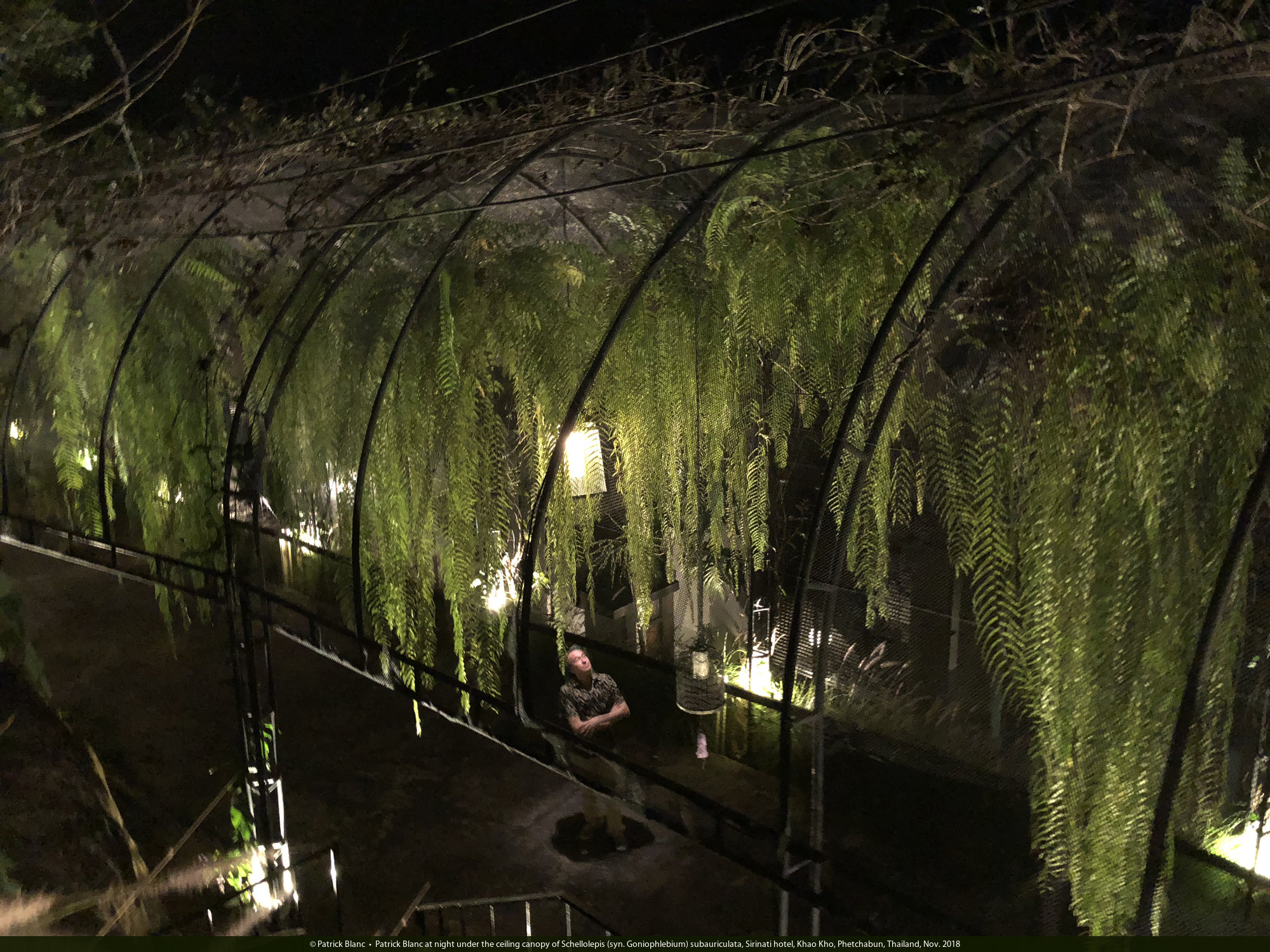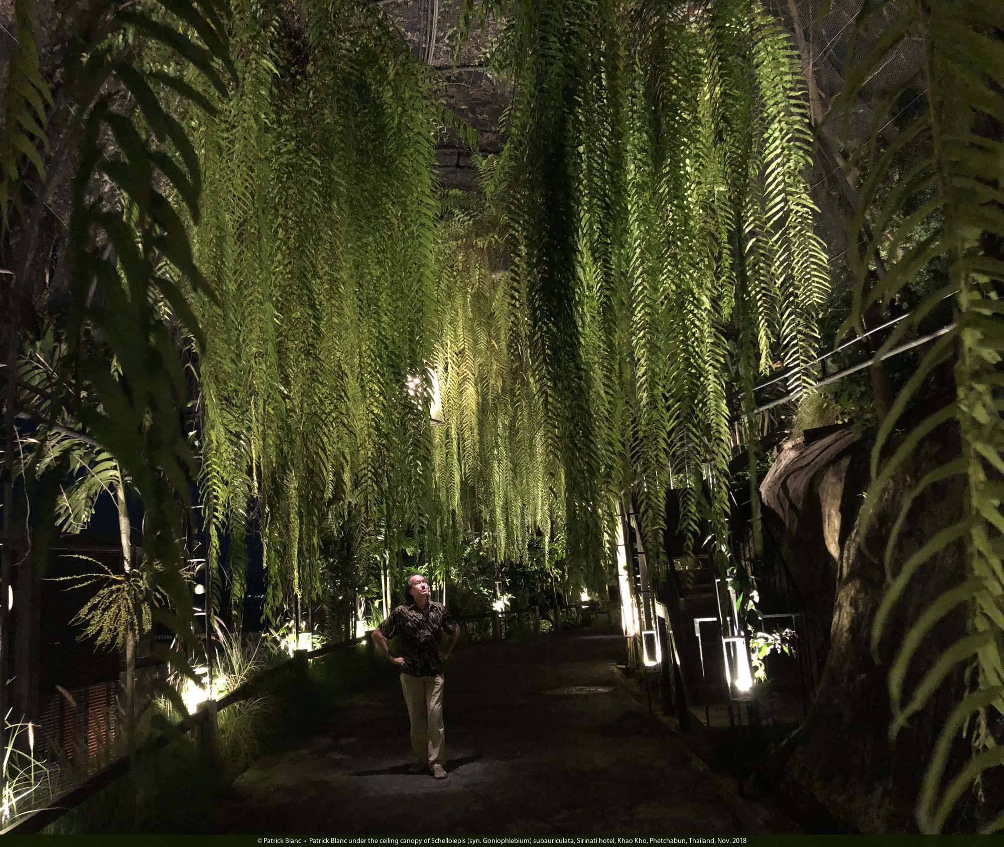 Patrick Blanc under the ceiling canopy of Schellolepis (syn. Goniophlebium) subauriculata, Sirinati hotel, Khao Kho, Phetchabun, Thailand, Nov. 2018