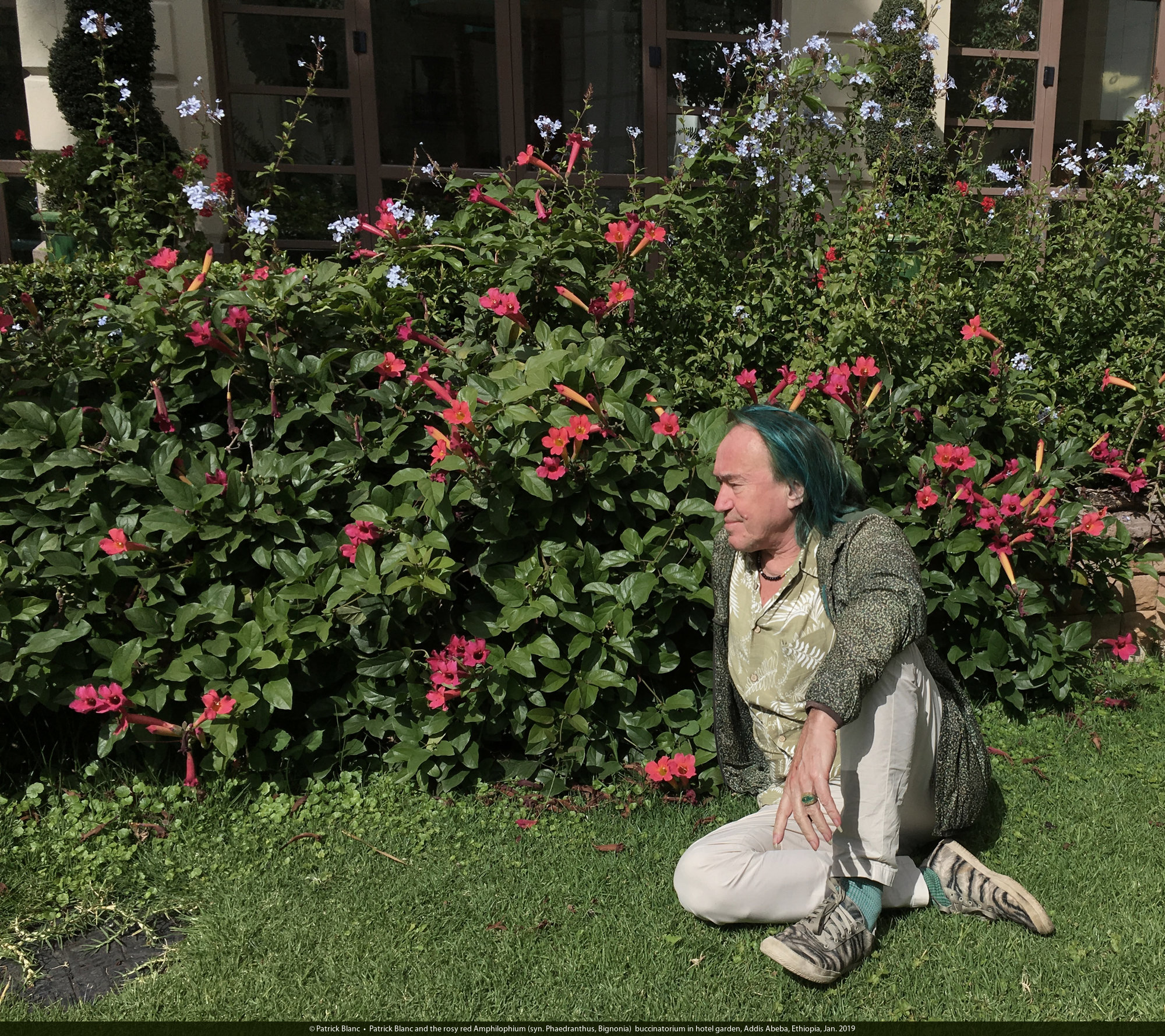 Patrick Blanc and the rosy red Amphilophium (syn. Phaedranthus, Bignonia) buccinatorium in hotel garden, Addis Abeba, Ethiopia, Jan. 2019
