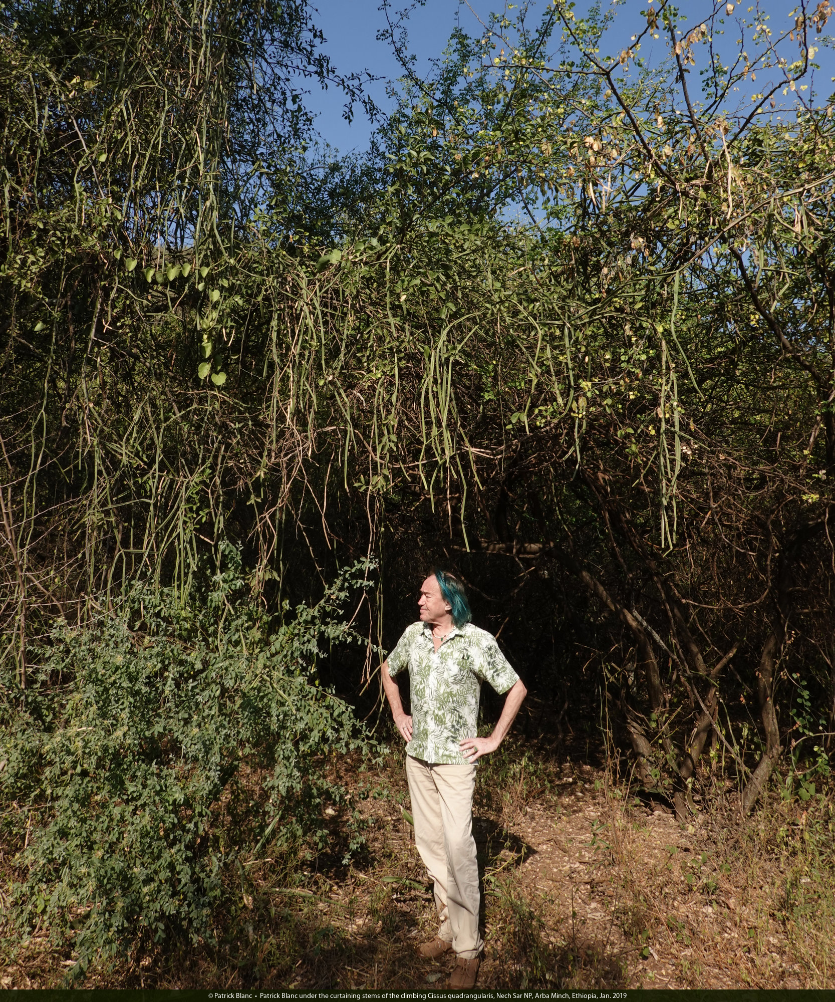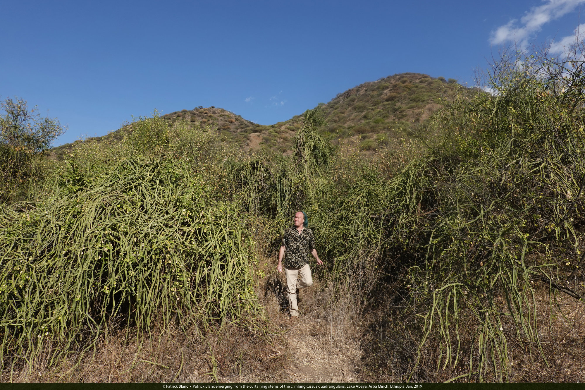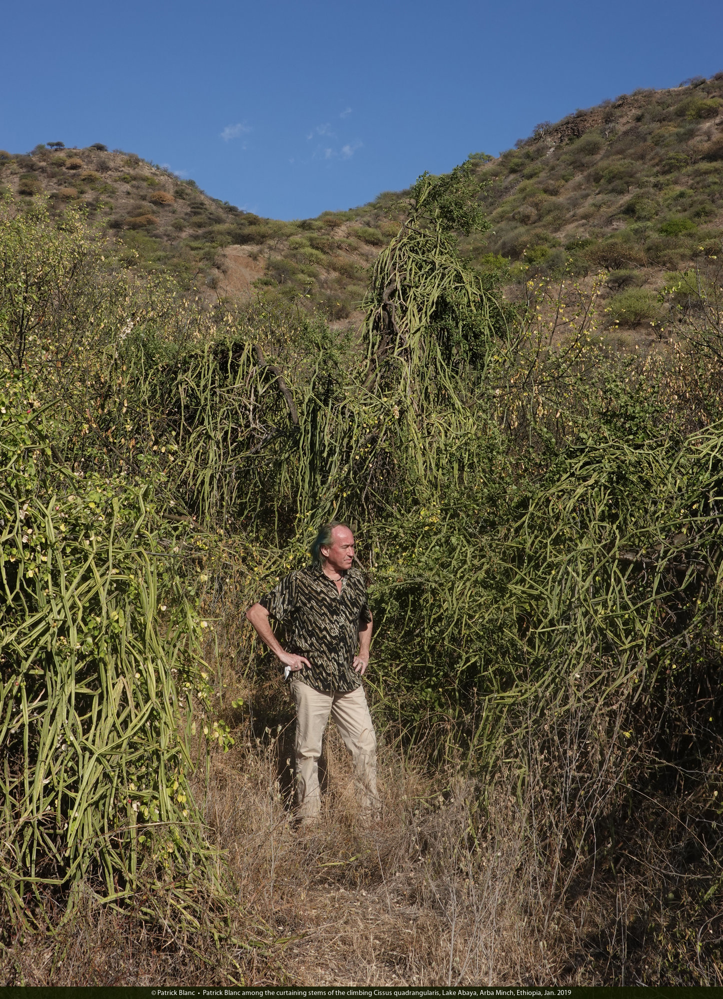 Patrick Blanc among the curtaining stems of the climbing Cissus quadrangularis, Lake Abaya, Arba Minch, Ethiopia, Jan. 2019