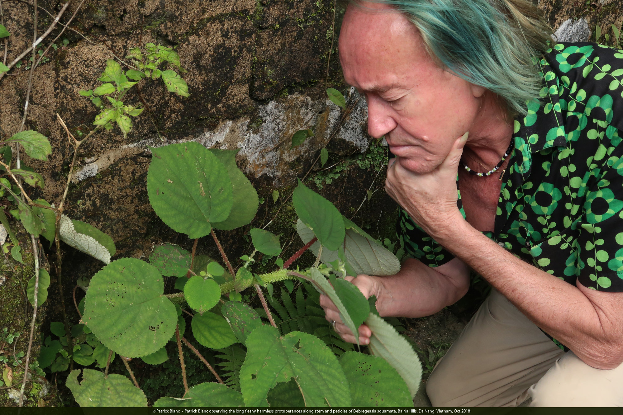 Patrick Blanc observing the long fleshy harmless protuberances along stem and petioles of Debregeasia squamata, Ba Na Hills, Da Nang, Vietnam, Oct.2018