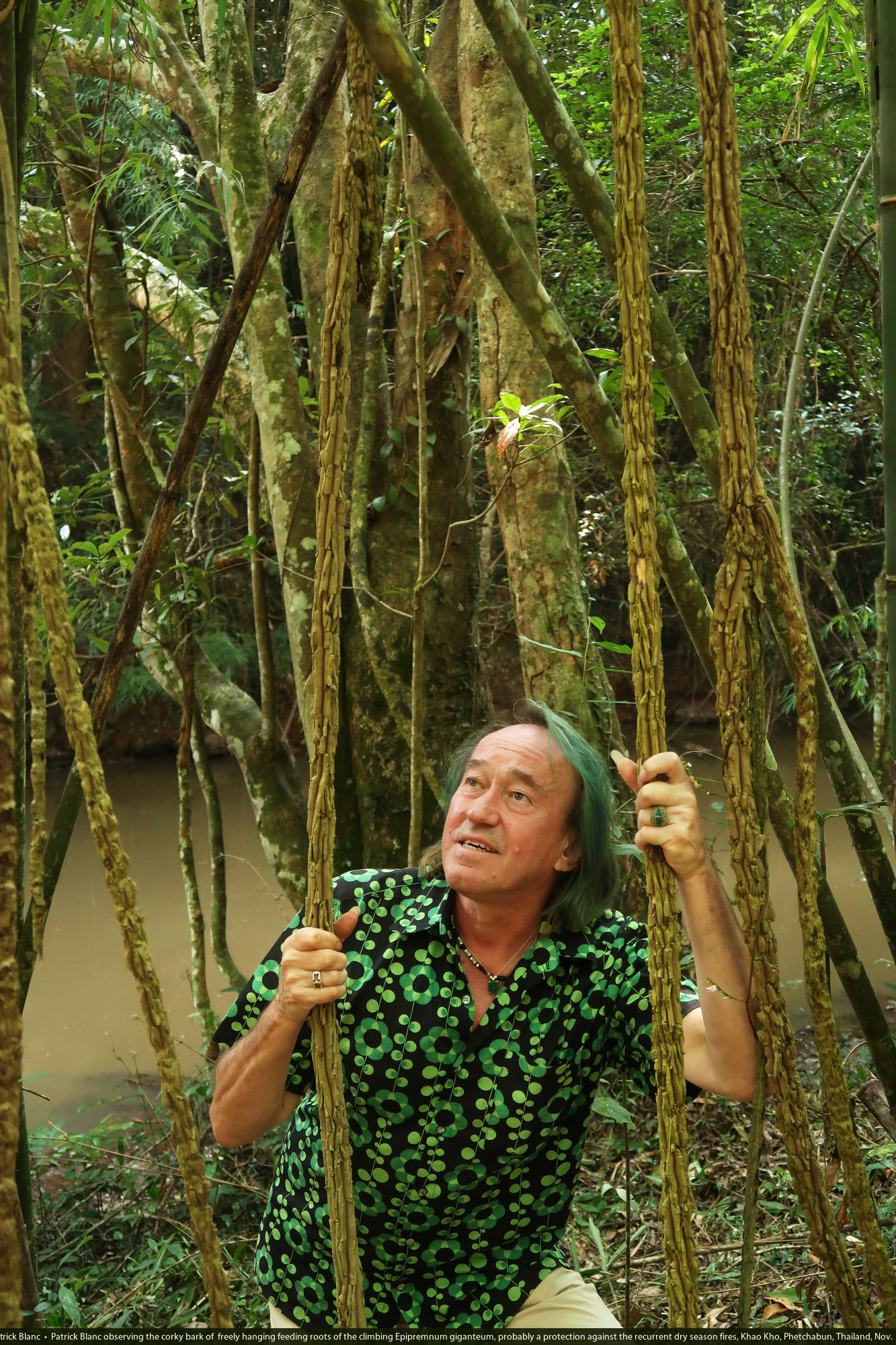 Patrick Blanc observing the corky bark of freely hanging feeding roots of the climbing Scindapsus maclurei, probably a protection against the recurrent dry season fires, Khao Kho, Phetchabun, Thailand, Nov. 2018
