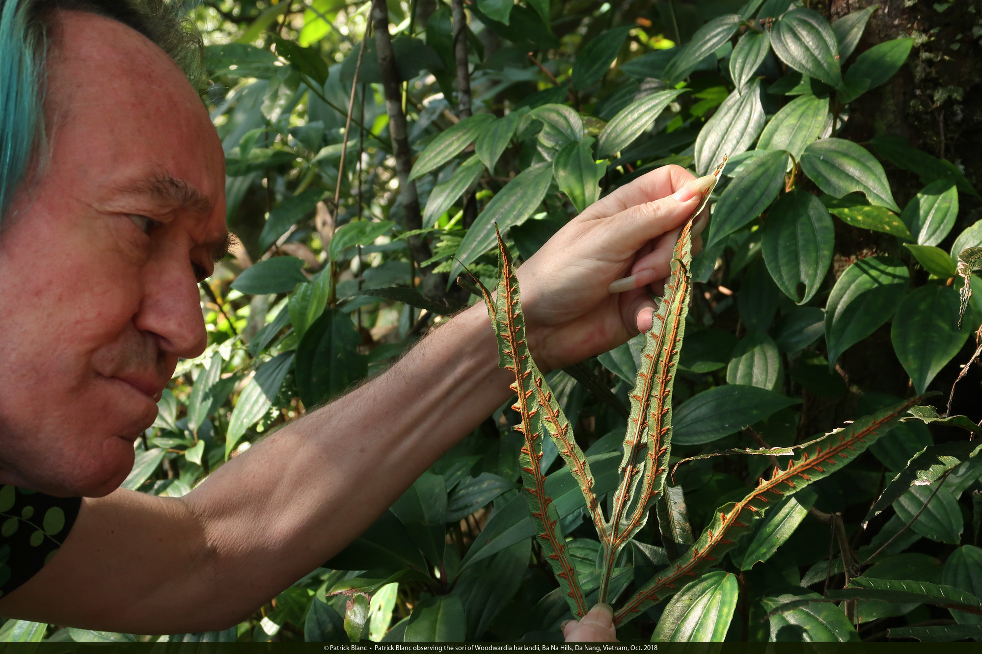 Patrick Blanc observing the sori of Woodwardia harlandii, Ba Na Hills, Da Nang, Vietnam, Oct. 2018