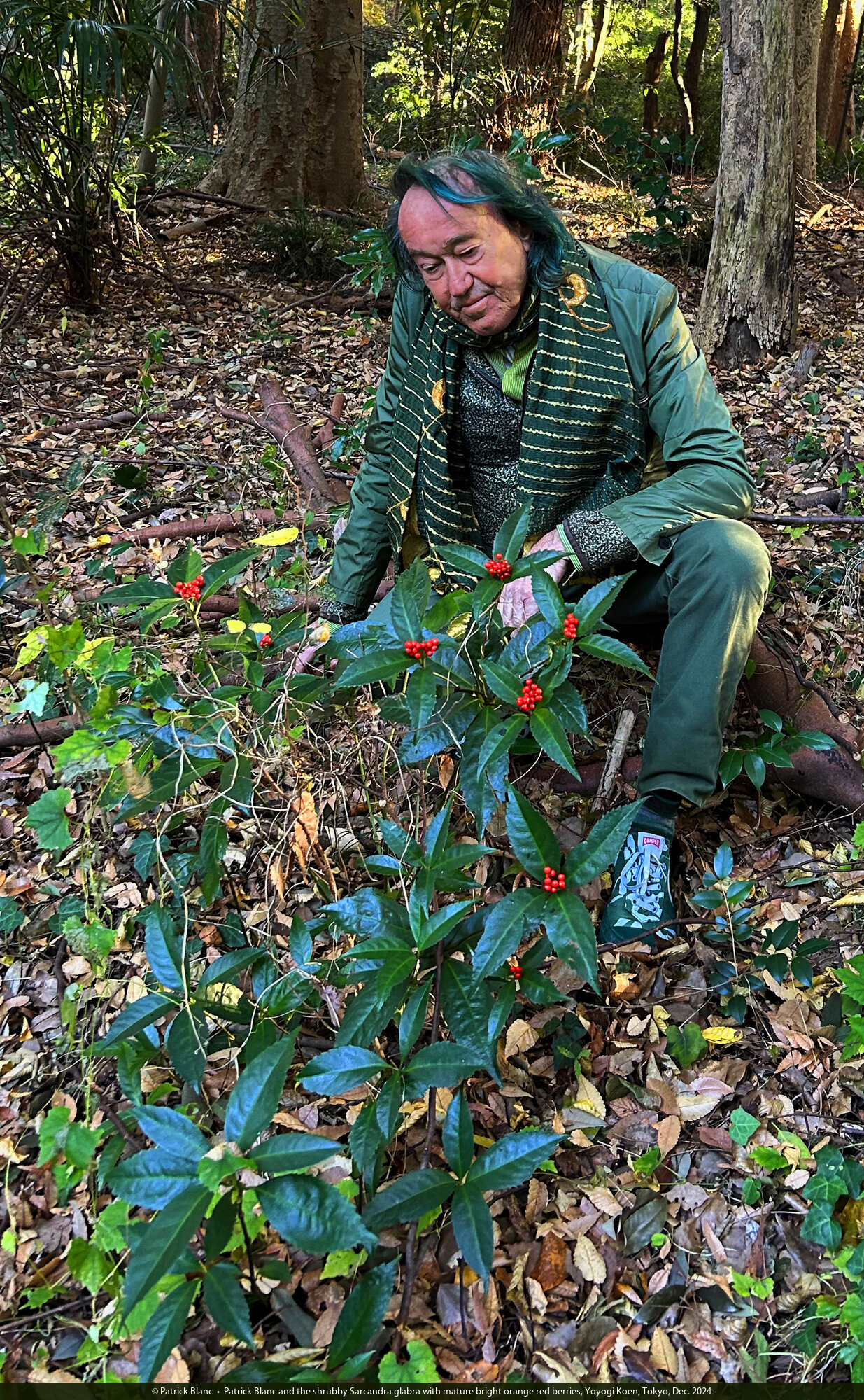 Patrick Blanc among fruiting Sarcandra glabra in forest understory, Yoyogi Koen, Tokyo, Dec. 2024