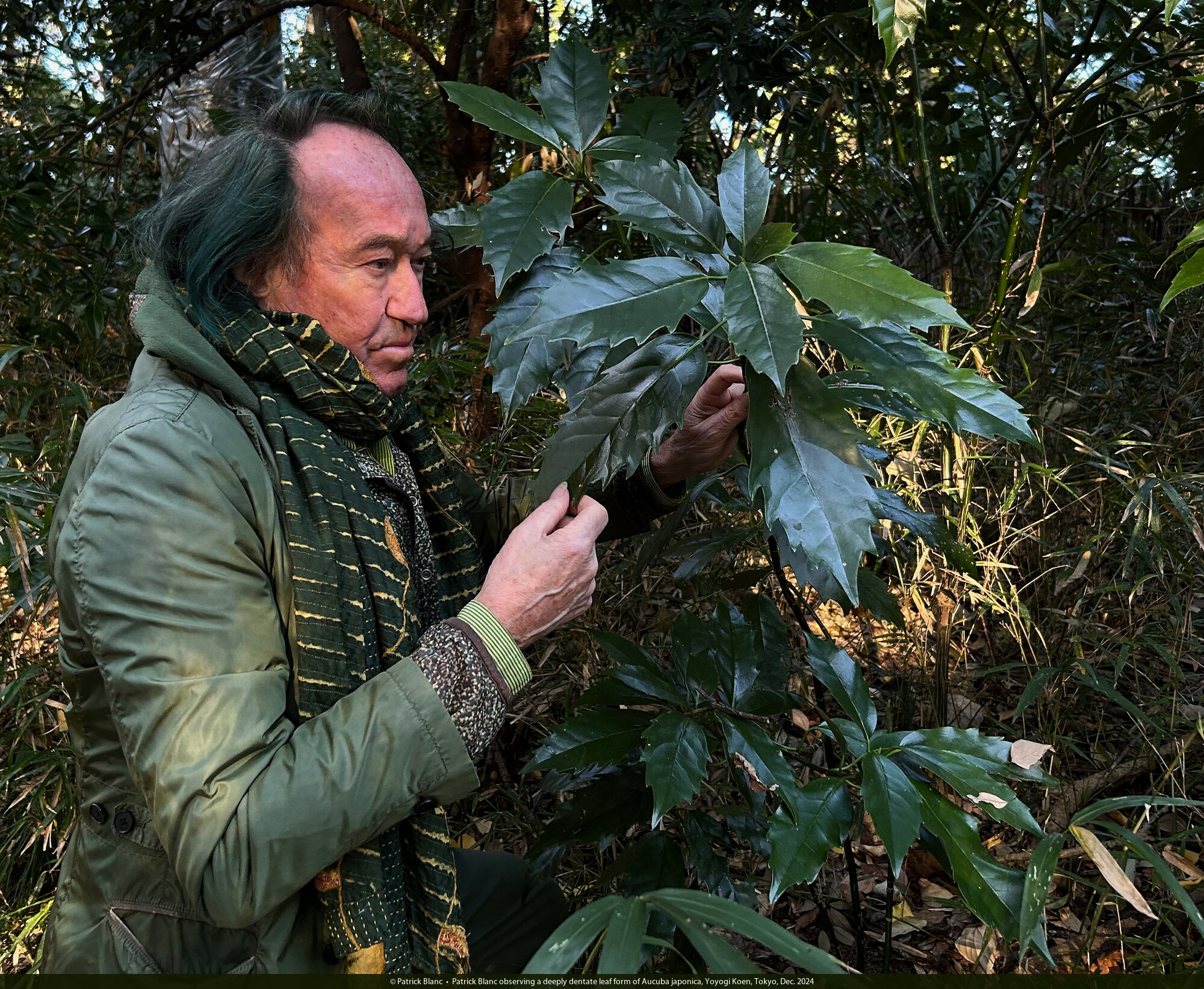 Patrick Blanc observing a deeply dentate leaf form of Aucuba japonica, Yoyogi Koen, Tokyo, Dec. 2024