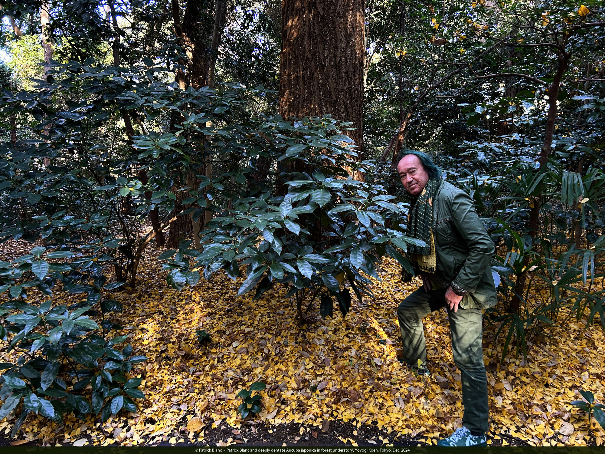 Patrick Blanc and deeply dentate Aucuba japonica in forest understory, Yoyogi Koen, Tokyo, Dec. 2024