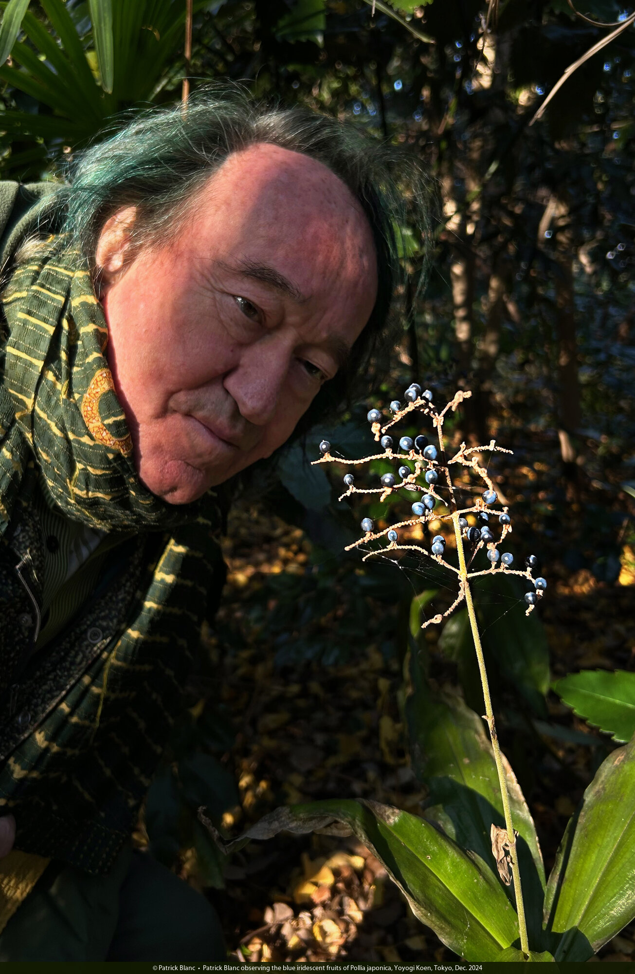 Patrick Blanc observing the blue iridescent fruits of Pollia japonica, Yoyogi Koen, Tokyo, Dec. 2024