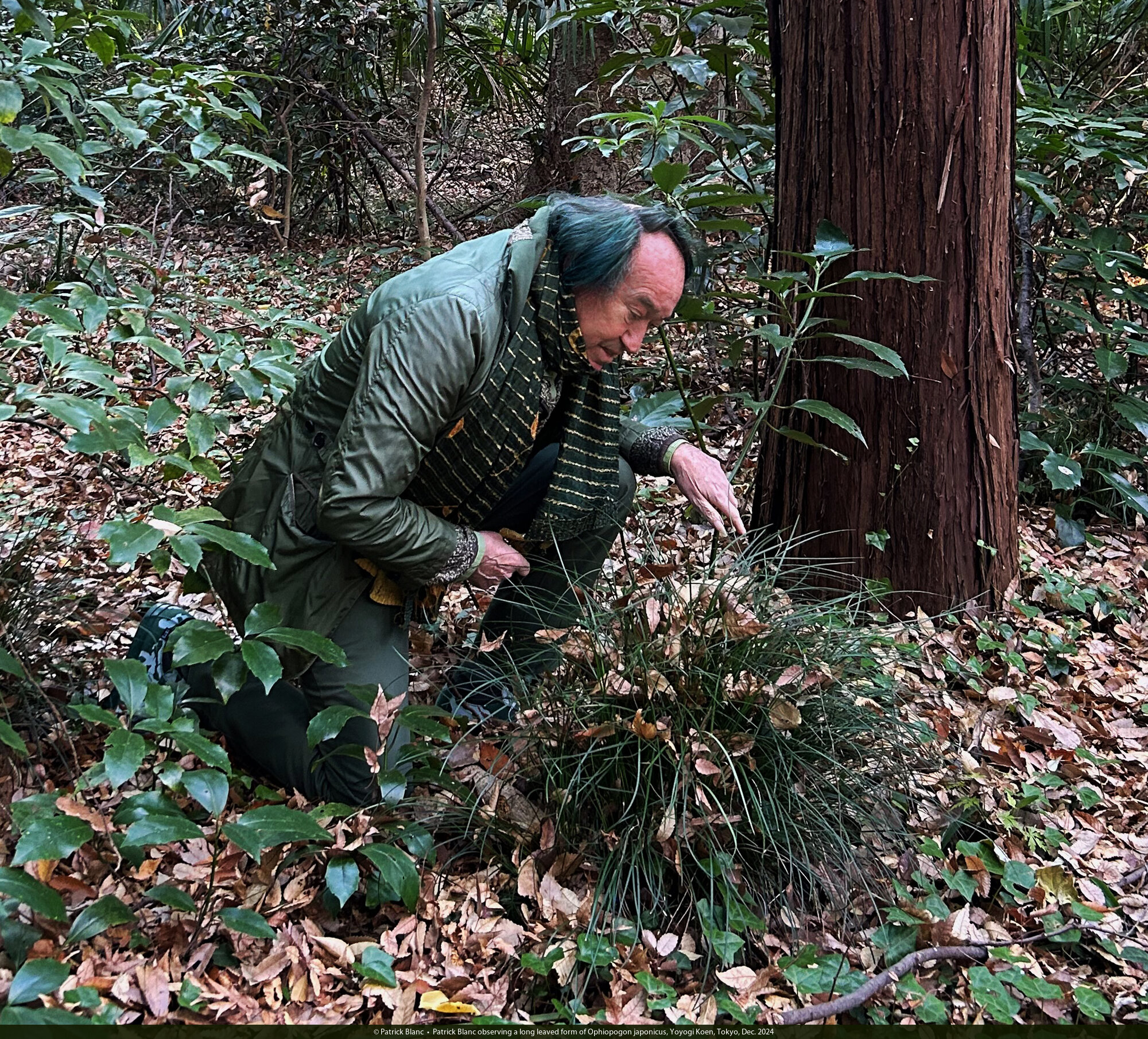 Patrick Blanc observing a long leaved form of Ophiopogon japonicus, Yoyogi Koen, Tokyo, Dec. 2024