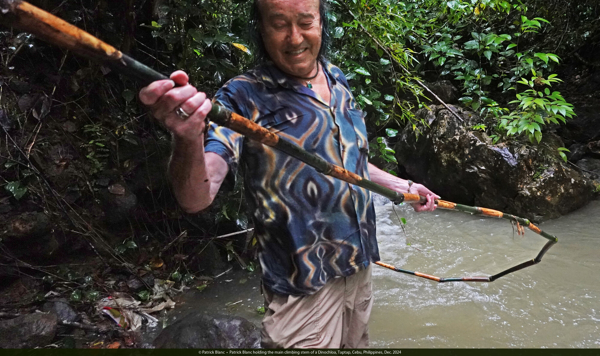 Patrick Blanc holding the main climbing stem of a Dinochloa, Taptap, Cebu, Philippines, Dec. 2024