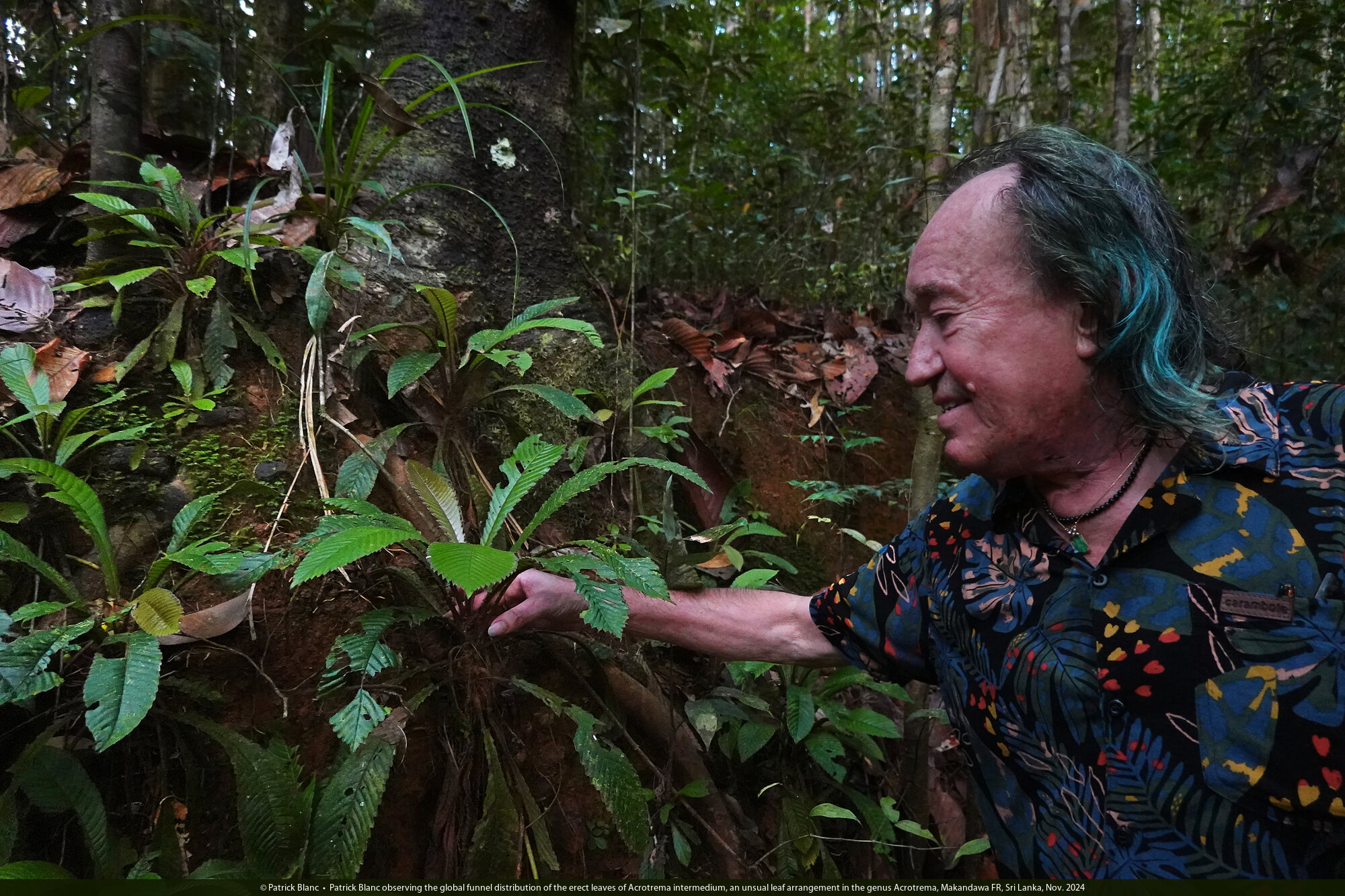 Patrick Blanc observing the global funnel distribution of the erect leaves of Acrotrema intermedium, an unsual leaf arrangement in the genus Acrotrema, Makandawa FR, Sri Lanka, Nov. 2024