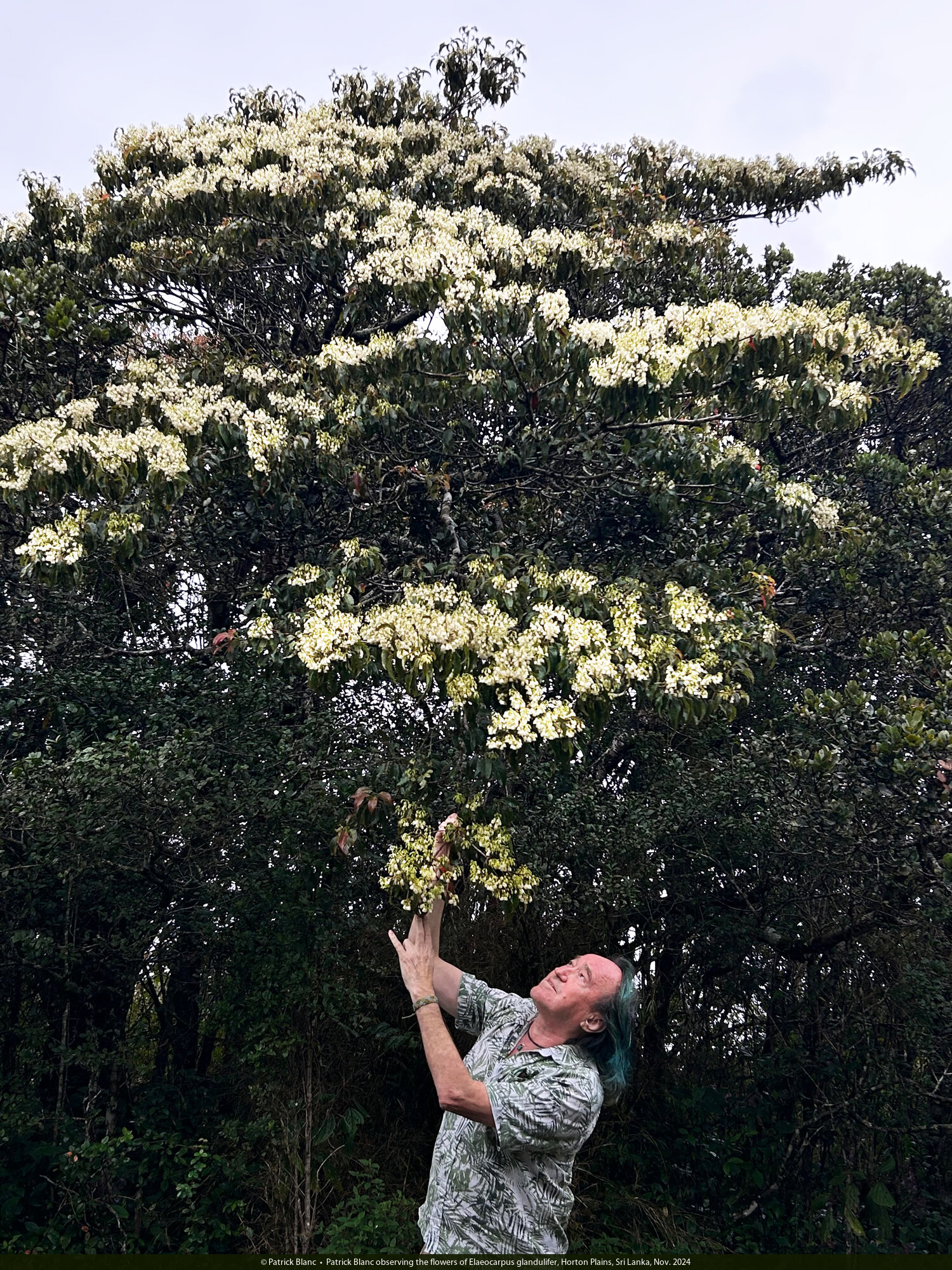 Patrick Blanc under an Elaeocarpus glandulifer in full bloom, Horton Plains, Sri Lanka, Nov. 2024