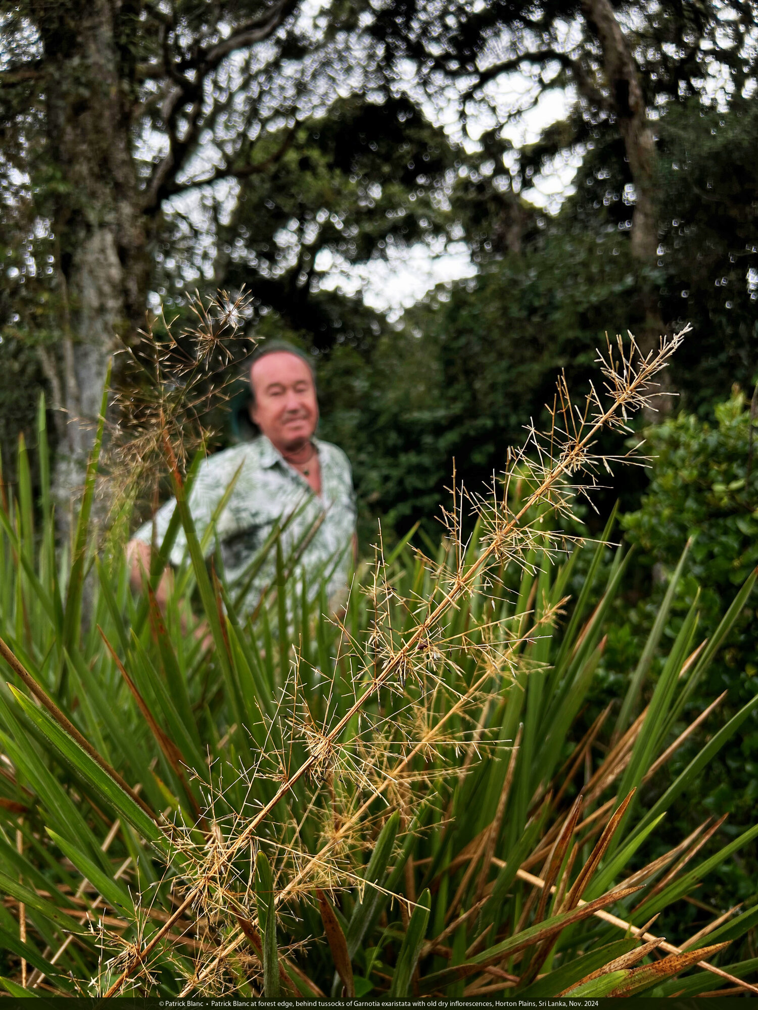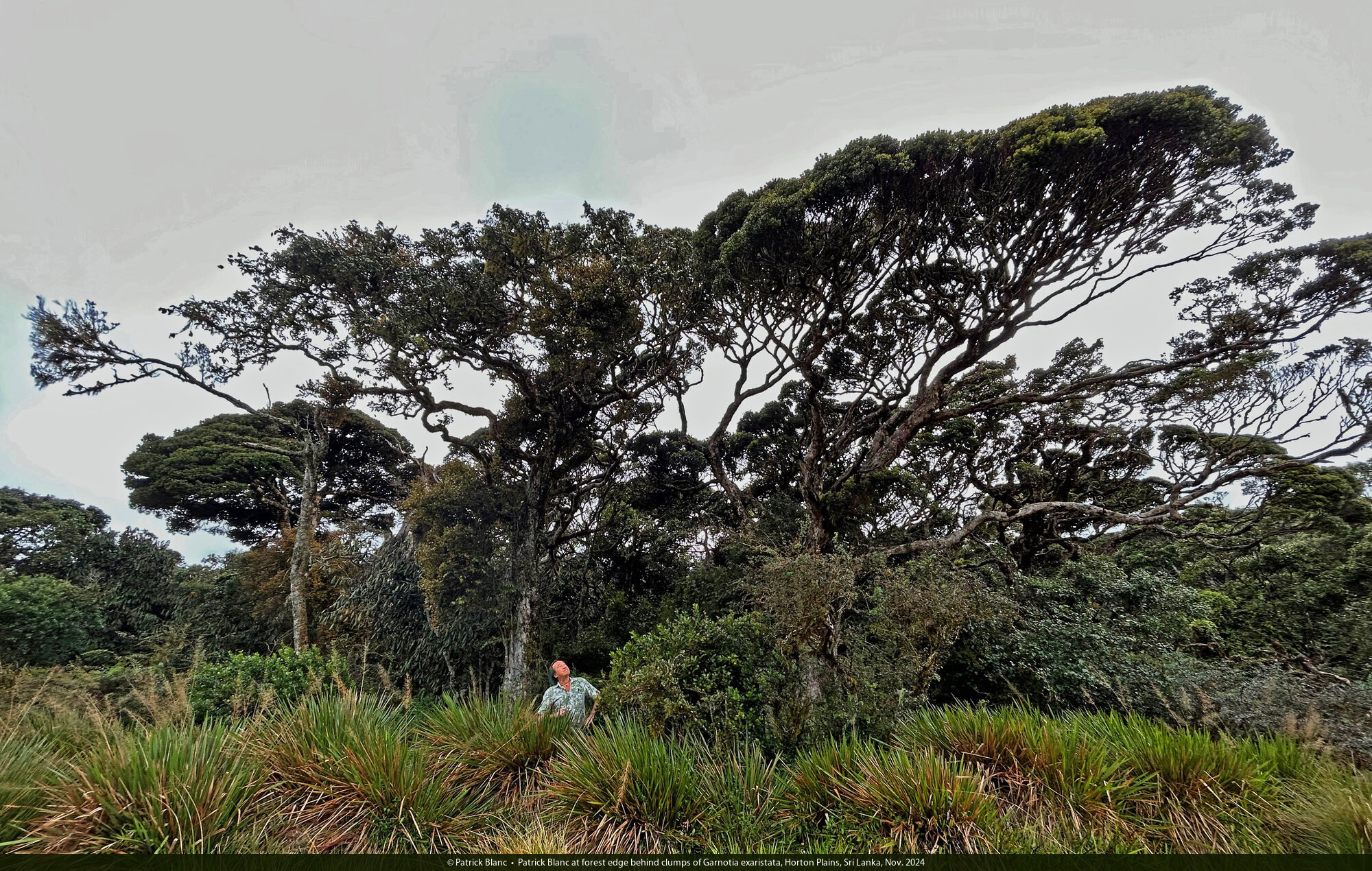 Patrick Blanc at forest edge behind clumps of Garnotia exaristata, Horton Plains, Sri Lanka, Nov. 2024