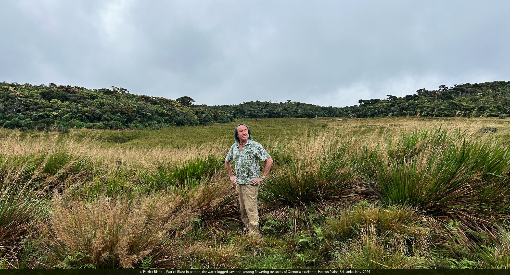Patrick Blanc in patana, the water logged savanna, among flowering tussocks of Garnotia exaristata, Horton Plains, Sri Lanka, Nov. 2024
