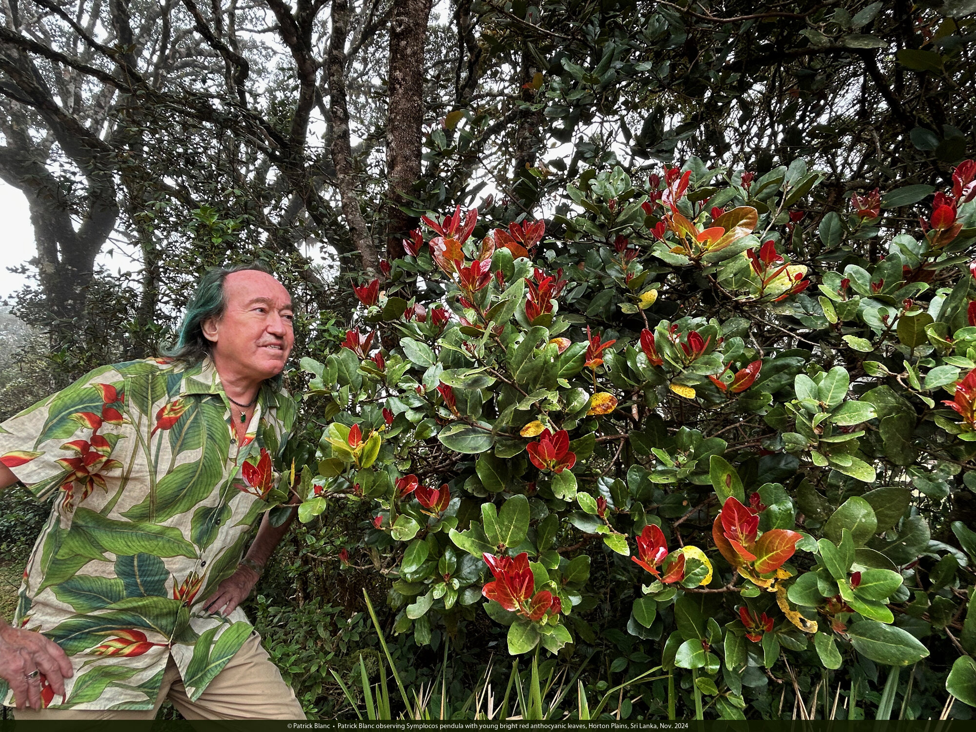 Patrick Blanc observing Isonandra montana with young bright red anthocyanic leaves, Horton Plains, Sri Lanka, Nov. 2024