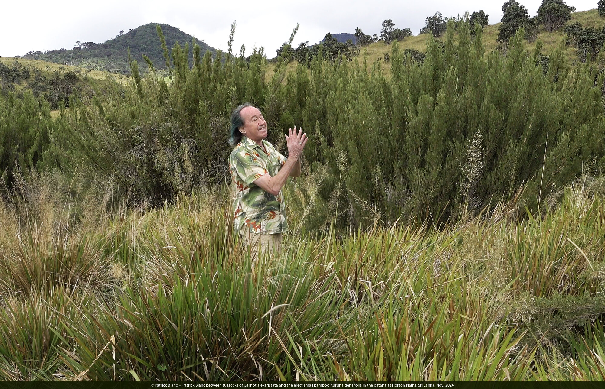 Patrick Blanc between tussocks of Garnotia exaristata and the erect small bamboo Kuruna densifolia in the patana at Horton Plains, Sri Lanka, Nov. 2024