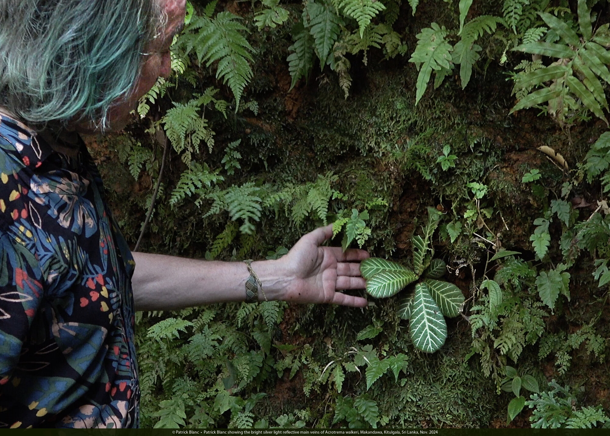 Patrick Blanc showing the bright silver light reflective main veins of Acrotrema walkeri, Makandawa, Kitulgala, Sri Lanka, Nov. 2024