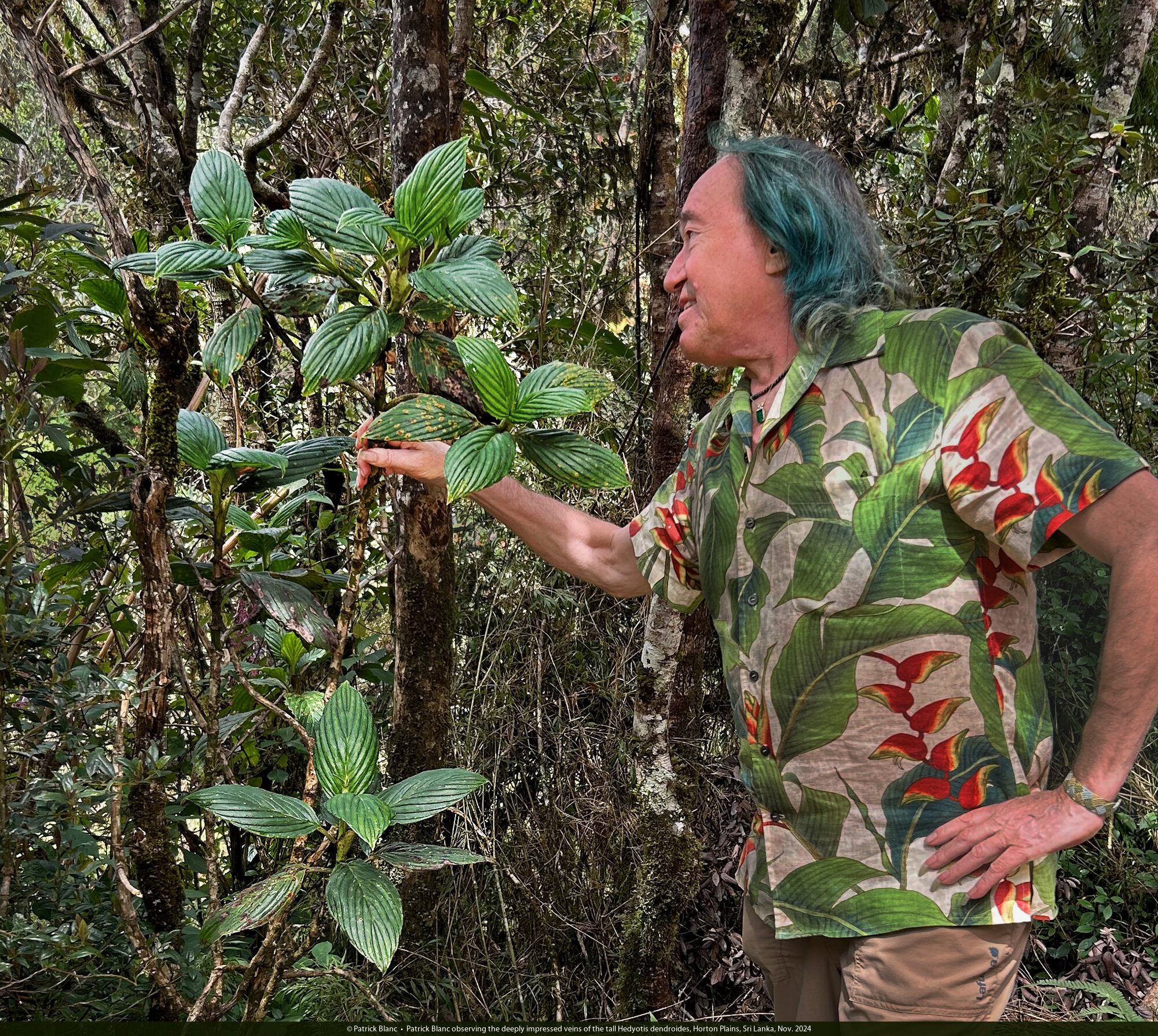 Patrick Blanc observing the deeply impressed veins of the tall Hedyotis dendroides, Horton Plains, Sri Lanka, Nov. 2024