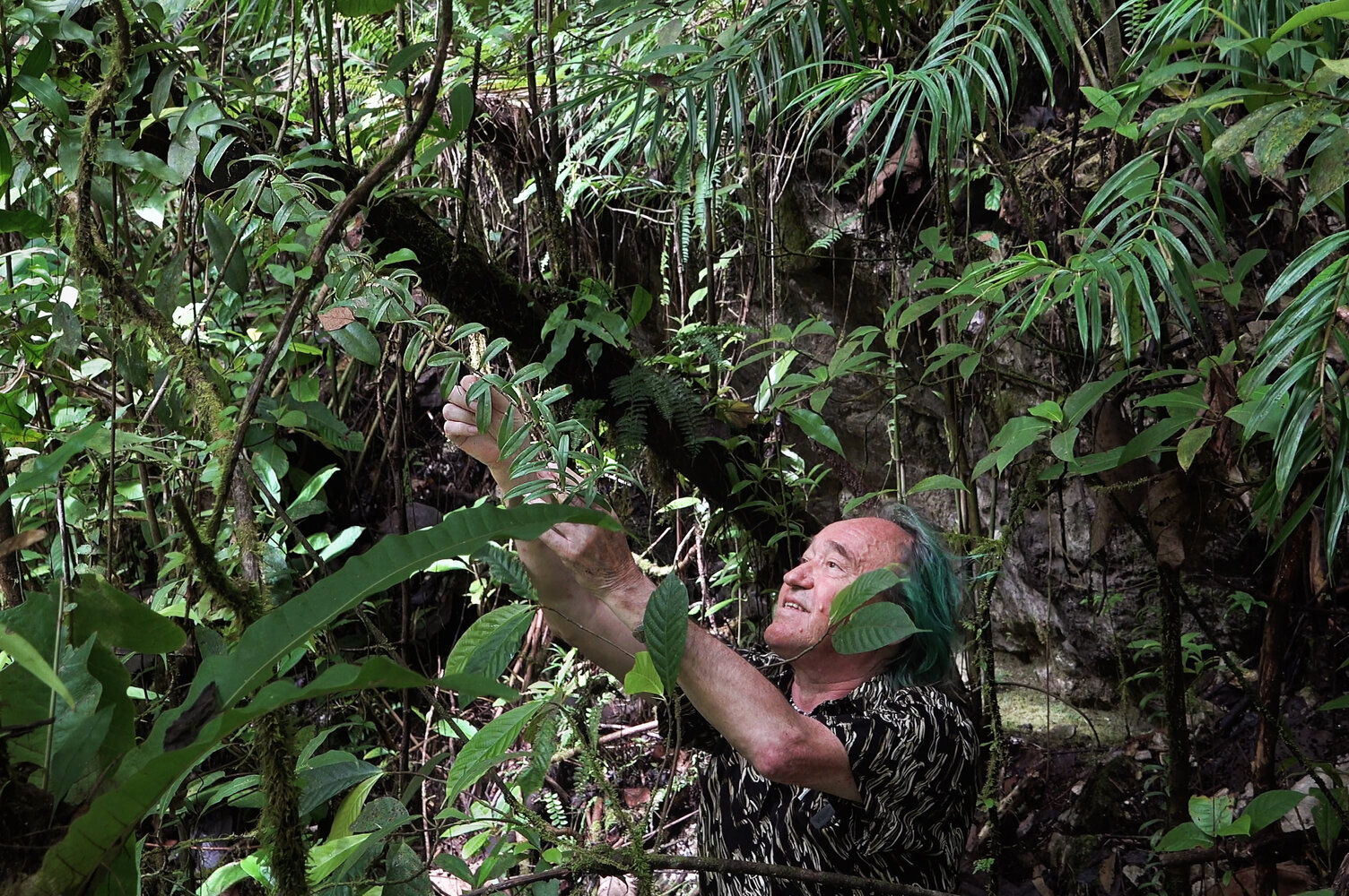 Patrick Blanc observing the blue iridescent fronds of Antrophyum reticulatum, Sinharaja, Sri Lanka, Nov. 2024