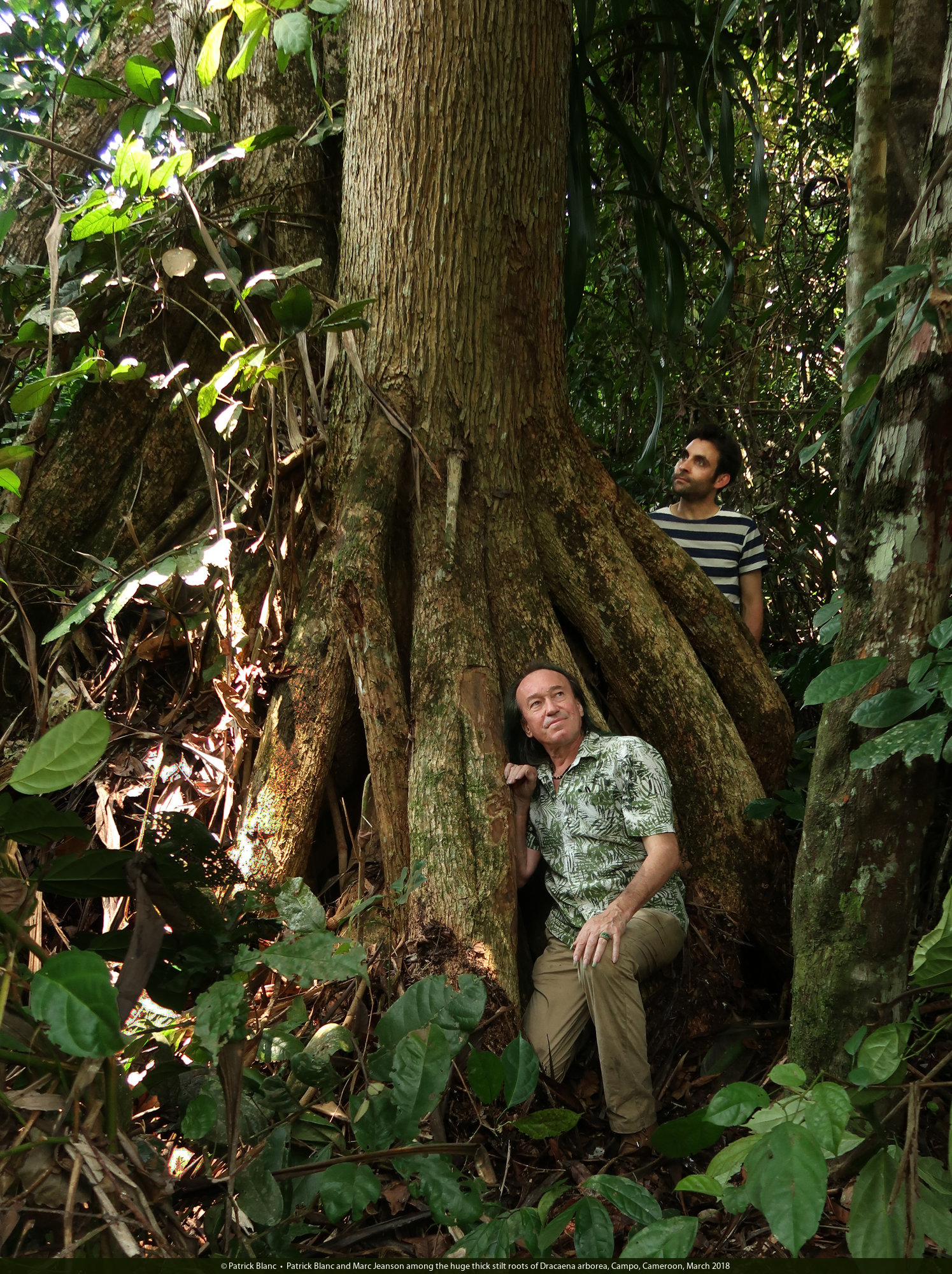 Patrick Blanc and Marc Jeanson among the huge thick stilt roots of Dracaena arborea, Campo, Cameroon, March 2018