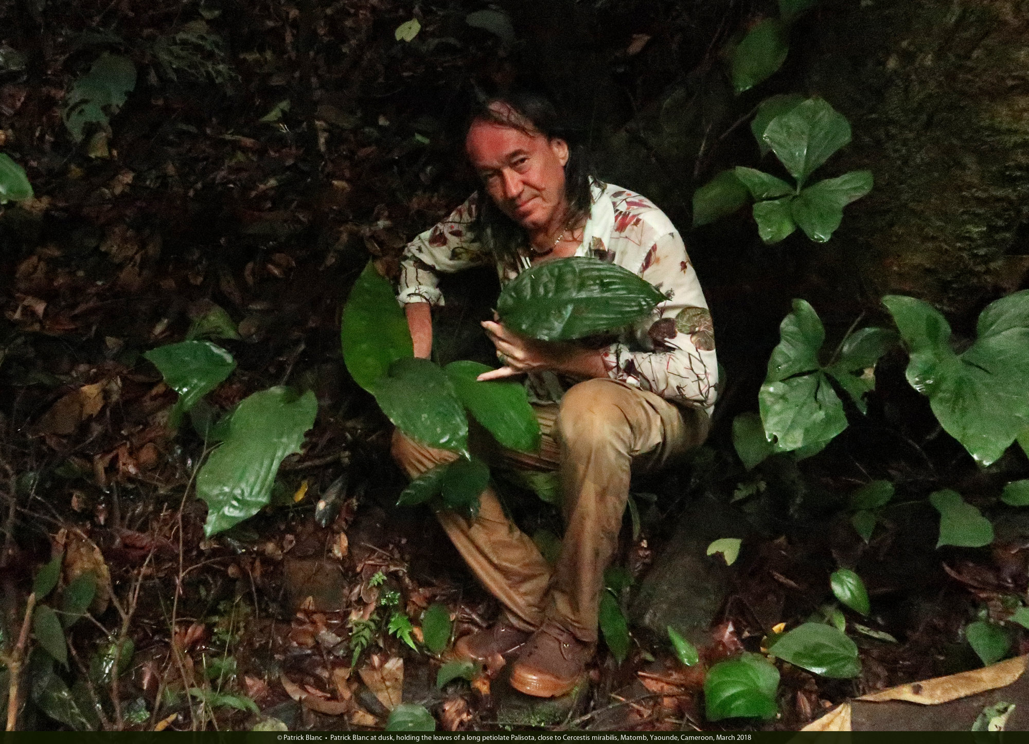Patrick Blanc at dusk, holding the leaves of a long petiolate Palisota, close to Cercestis mirabilis, Matomb, Yaounde, Cameroon, March 2018