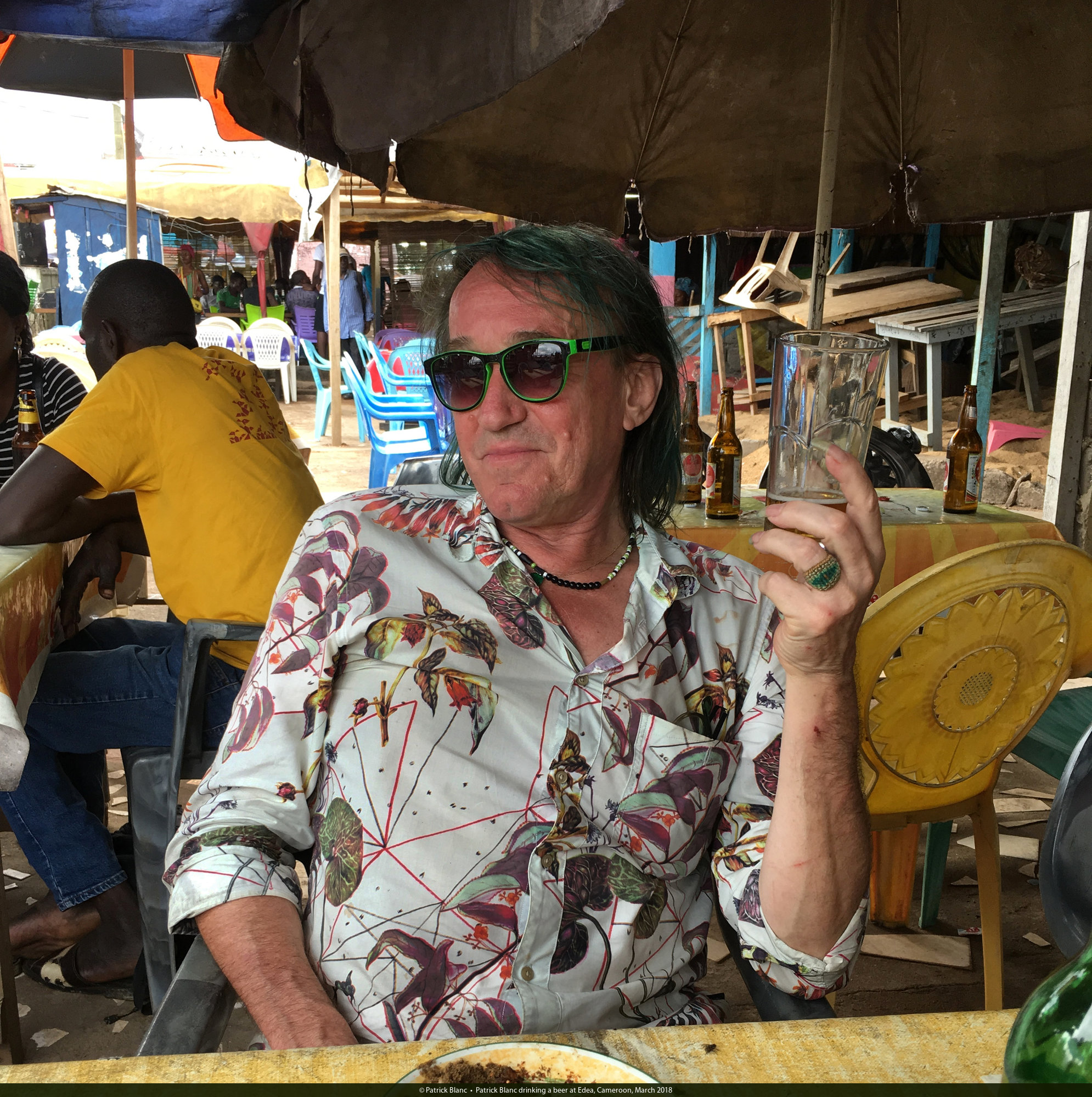 Patrick Blanc drinking a beer at Edea, Cameroon, March 2018