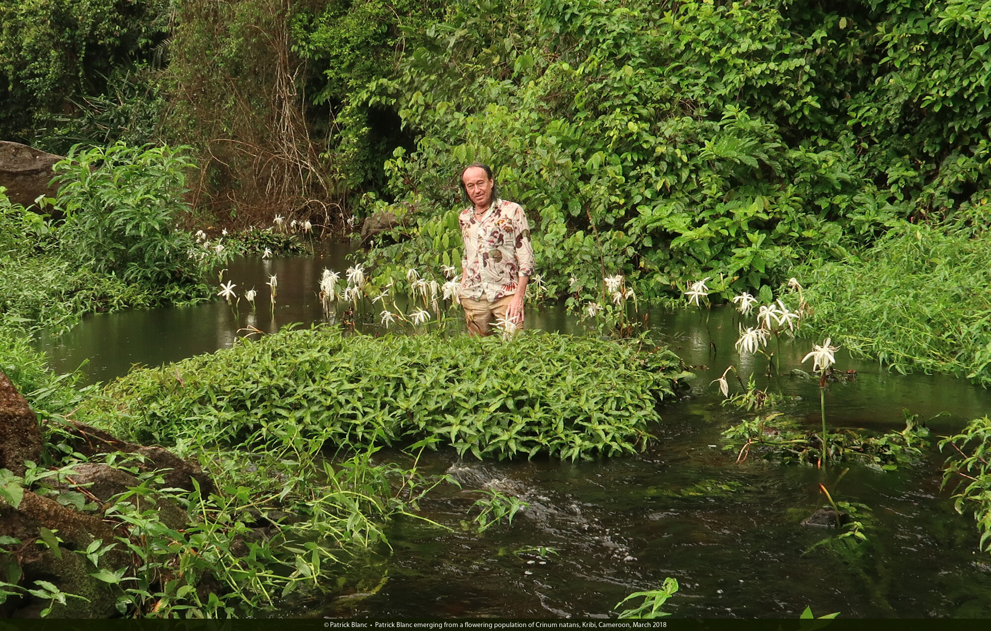 Patrick Blanc emerging from a flowering population of Crinum natans, Kribi, Cameroon, March 2018