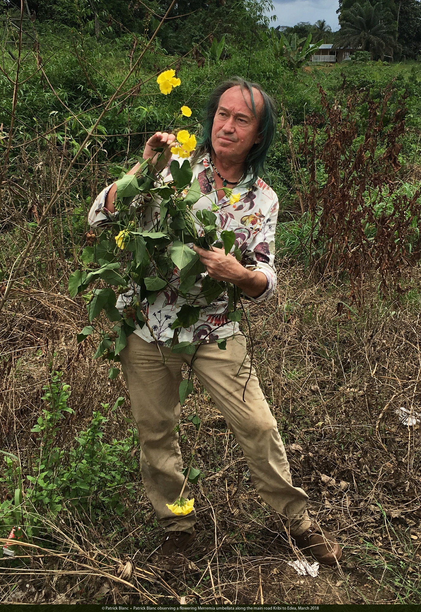 Patrick Blanc holding a flowering specimen of Merremia umbellata, Kribi, Cameroon, March 2018