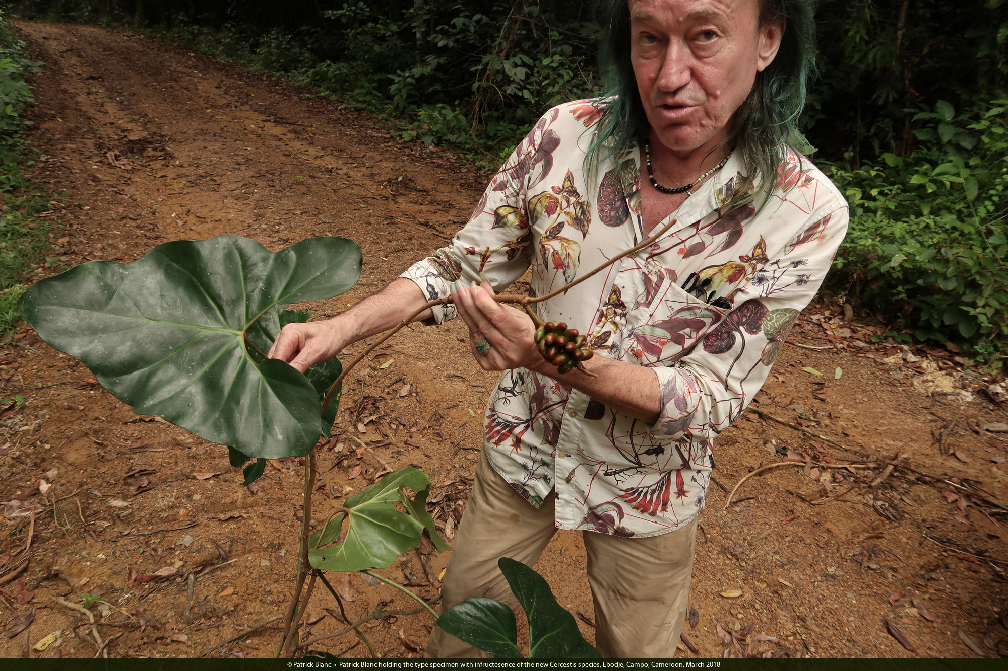Patrick Blanc holding a specimen with infructesence of the new Cercestis species, Ebodje, Campo, Cameroon, March 2018