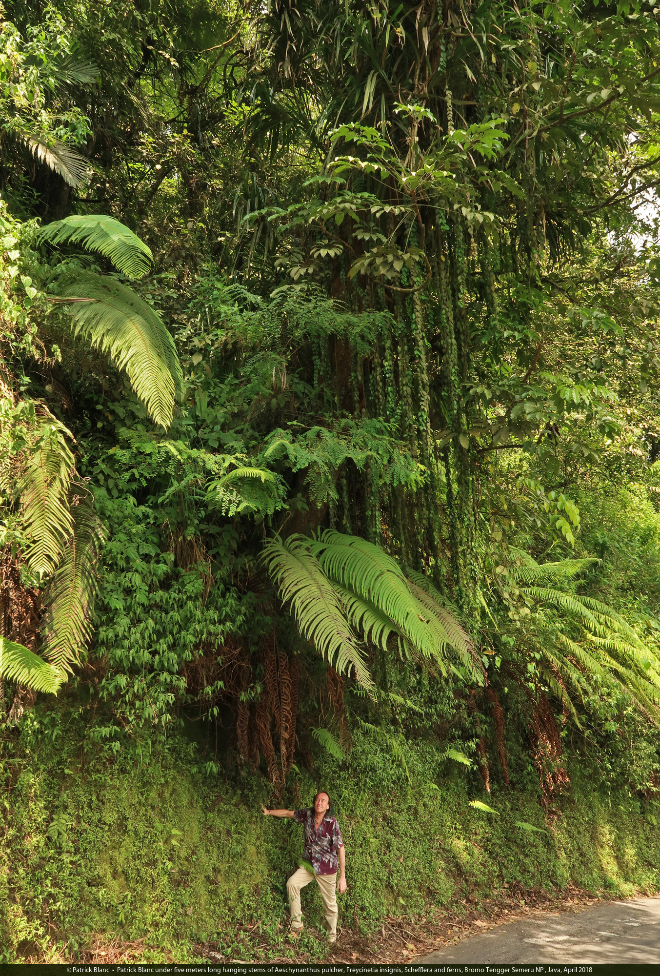 Patrick Blanc under five meters long hanging stems of Aeschynanthus pulcher, Freycinetia insignis, Schefflera and ferns, Bromo Tengger Semeru NP , Java, April 2018